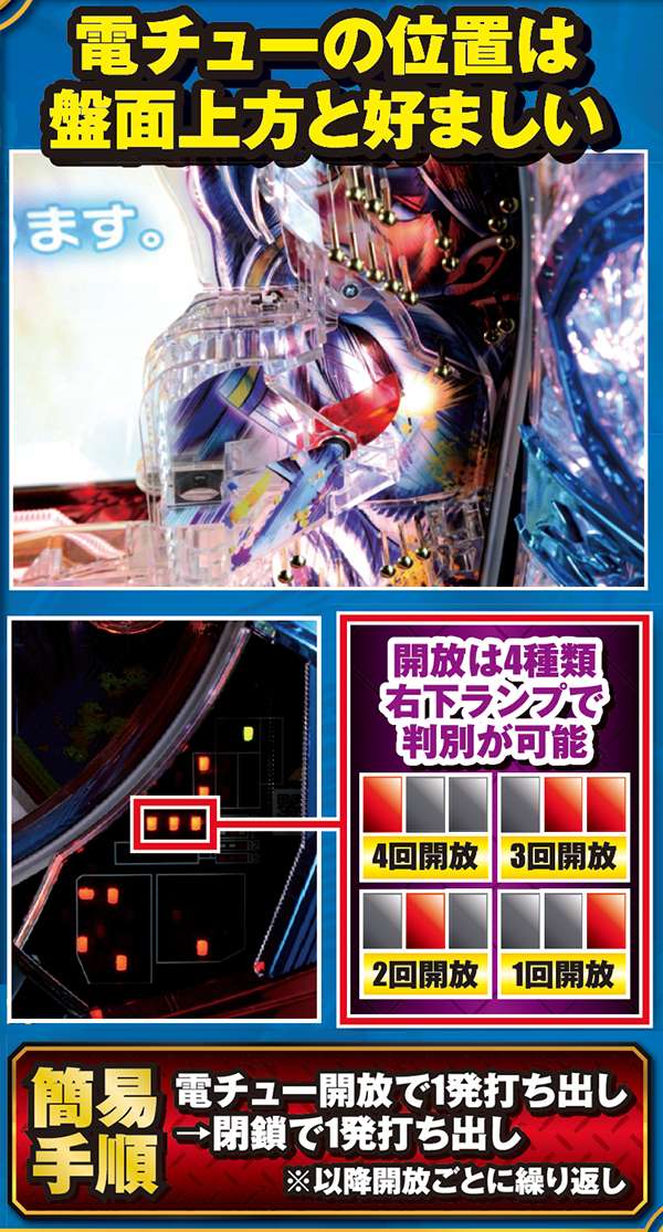 開放パターンは多いが、タイミングは一定なので難易度は易しめ。さらに、本機は電サポが付いた場合最低でも100回転が得られるので場合によっては大幅な玉増やしも見込めそうだ。ただし、単発打ちのため小デジタルが枯れやすいのと、開放回数が1〜2回に偏り玉が減る可能性もあるので要注意。
