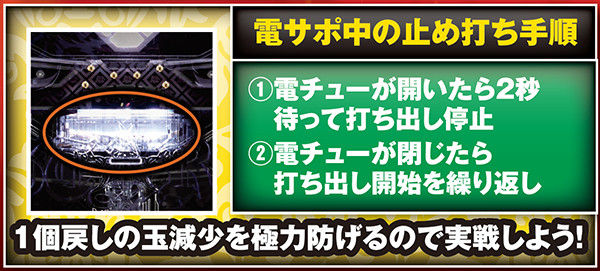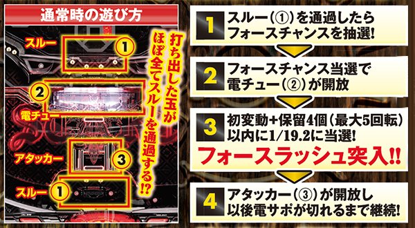 遊び方は一見難しそうに思えるが、普通に打ち出すだけで問題無し。電チュー開放(フォースチャンス)に当選後の5回転が勝負で、ここをクリアすれば大連チャンの扉が開く!?