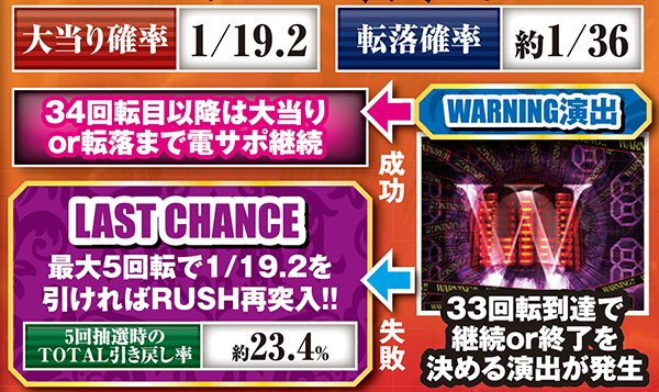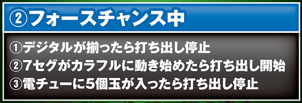 フォースラッシュは途中で転落を引いてしまっても33回転までは電サポは保証→34回転目にLAST CHANCEへと突入し、最大5回転の抽選を受けることができる。転落してない場合はエクストラへと昇格、大当りをゲットすればラッシュ継続となるが、転落すると電サポはその時点で終了してしまう。
