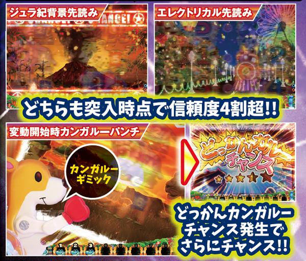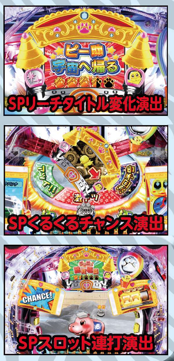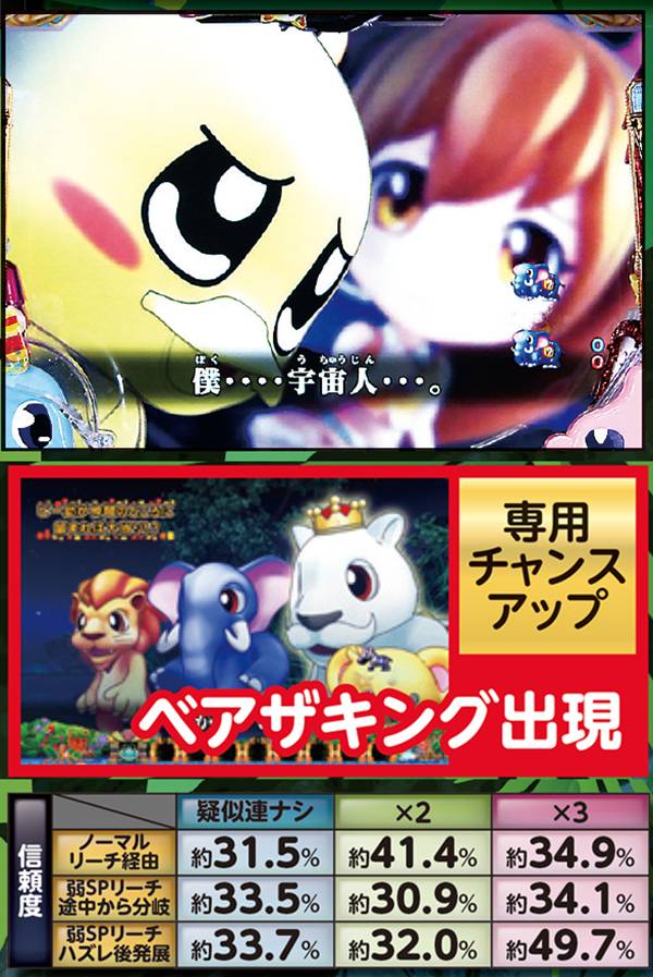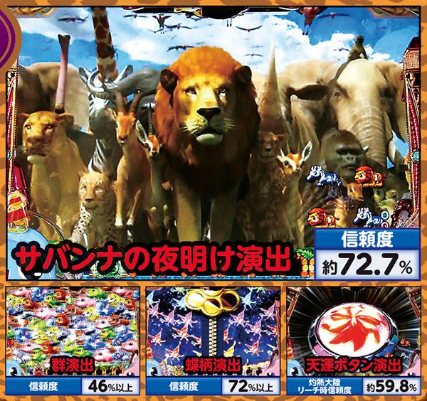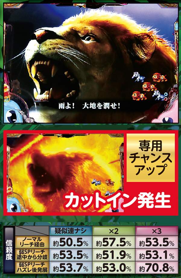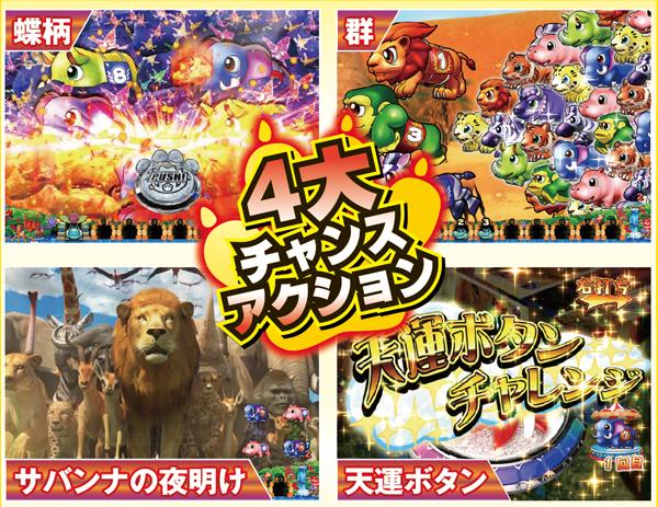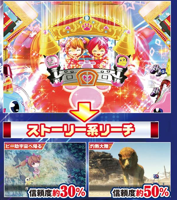スーパー発展時や弱系リーチハズレ後にサブ液晶が落下すれば好機の合図。ストーリー系への発展が約束され、最低でも3割が大当りへとつながる。さらにス トーリー系は上記の他、信頼度約7割を誇る「動物大パレード」も存在し、いずれも天運ボタン出現などのチャンスアップも搭載している。