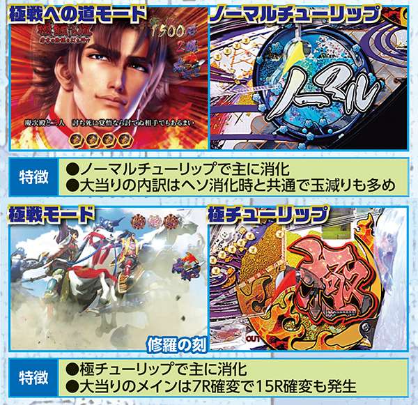 使用される電チューの仕様が違うので、2つの確変モードはゲーム性が異なる。上位となる極戦モードなら、7R確変がメインとなり、15R確変も存在する。さらに電サポ中の玉減りも抑えられているのだ。