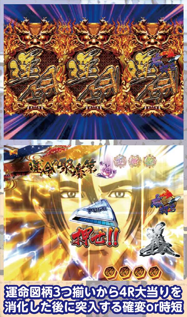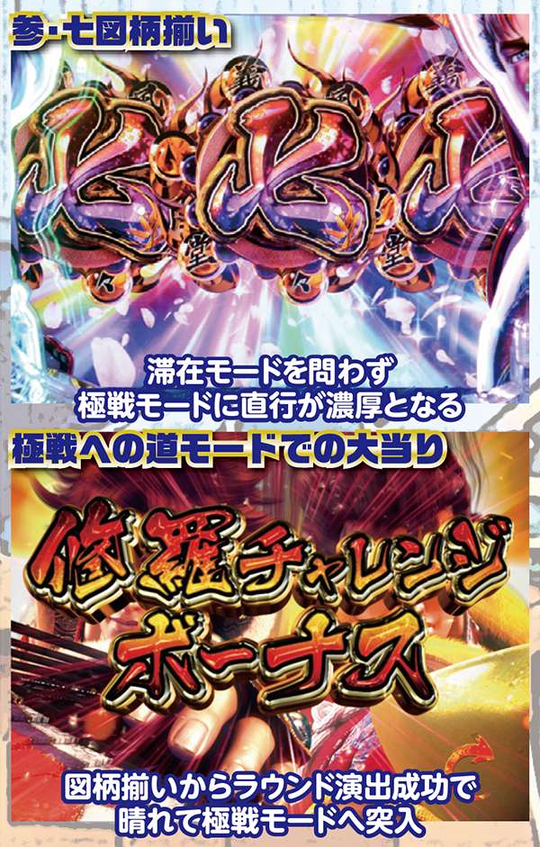 上位の確変となる極戦モードに突入させるポイントは全部で3つ。参と七図柄揃いなら、極戦モードに一直線だ。