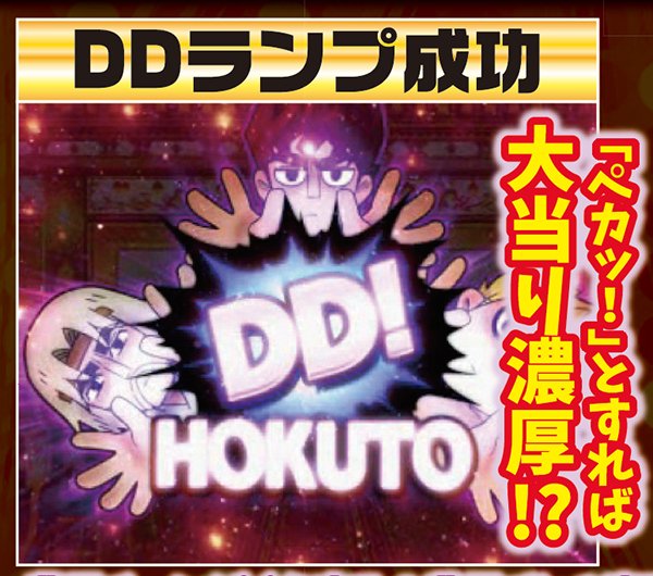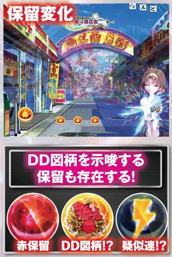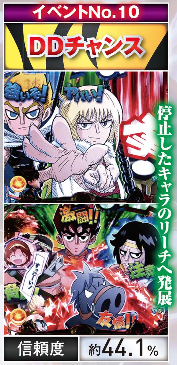 様々なタイミングで出現するDD図柄が画面中央に停止すれば13種類存在するイベント予告のいずれかに発展。停止時のDD図柄が赤色なら信頼度約5割と激アツだ。