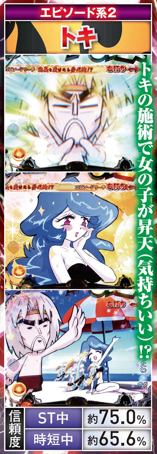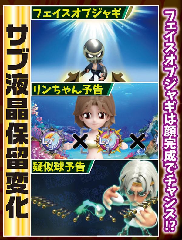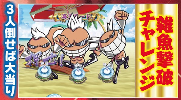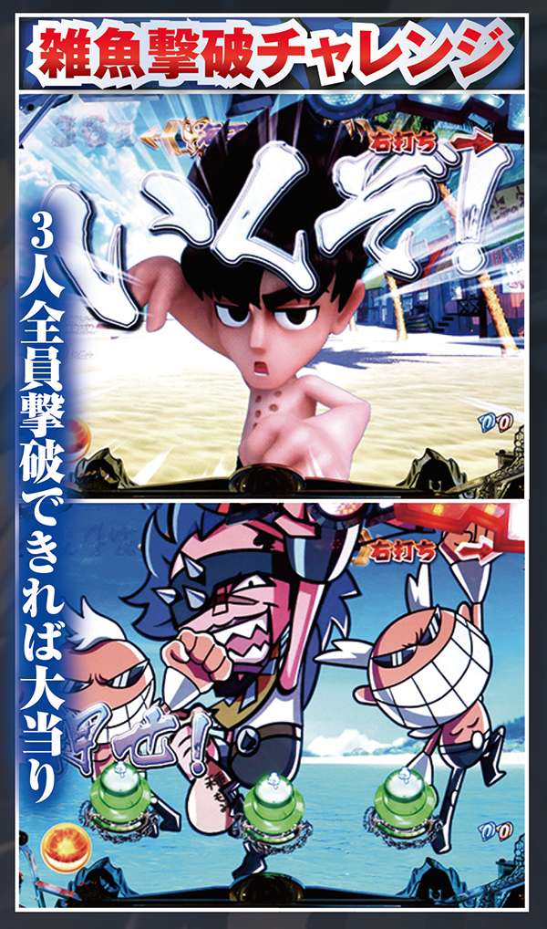 海王モード中の舞台はビーチ。ケンシロウが宿敵達とコミカルにバトルする全12種類のスーパーリーチや、成功すれば即大当りとなる予告で連チャンを狙う。なお時短orSTとなる思い出モードも、予告&リーチの種類は共通だ。