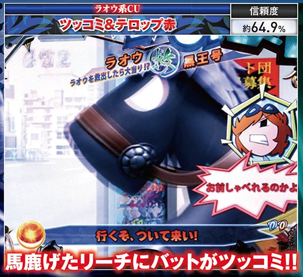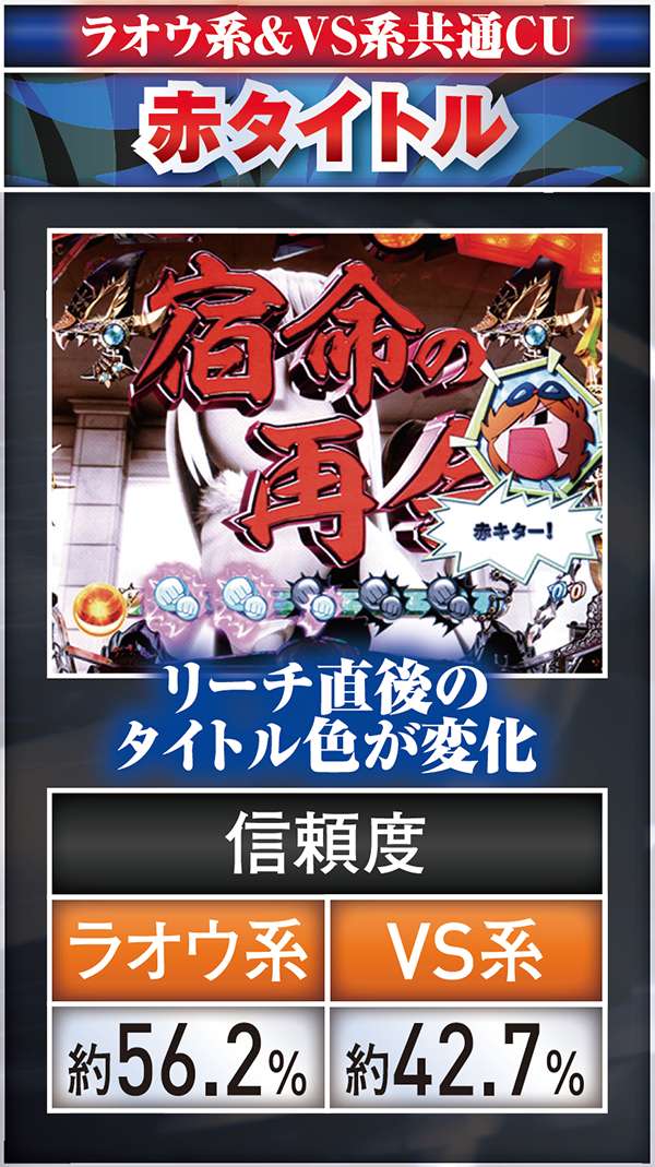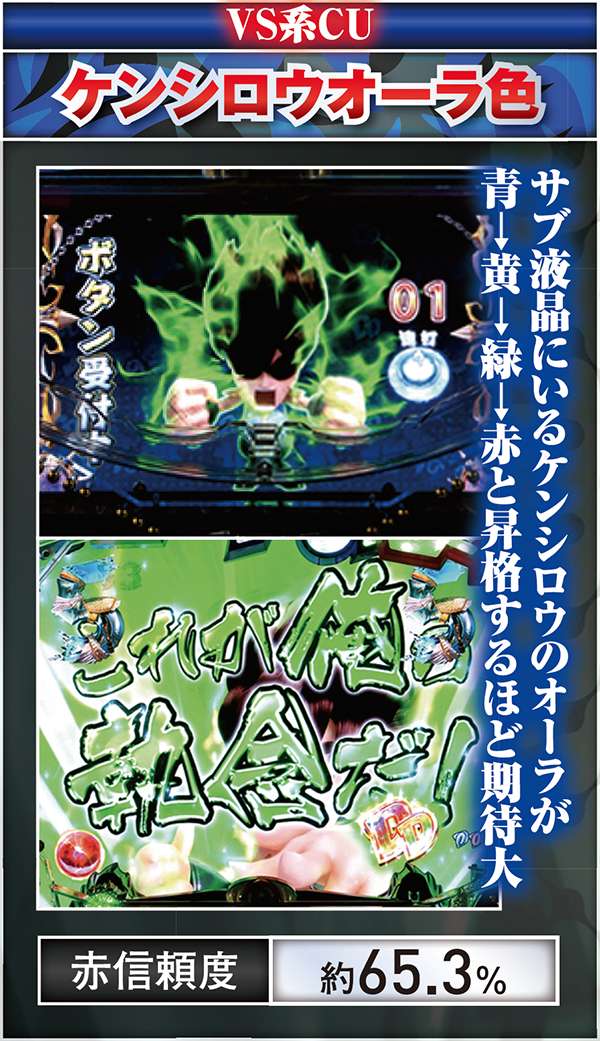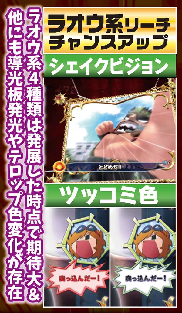 VS系orラオウ系リーチは終盤に出現するボタンの種類にも注目で、赤色なら大チャンス。お馴染みのレインボーに輝くド派手なインパクトボタンが飛び出せば、大当り濃厚となるぞ。