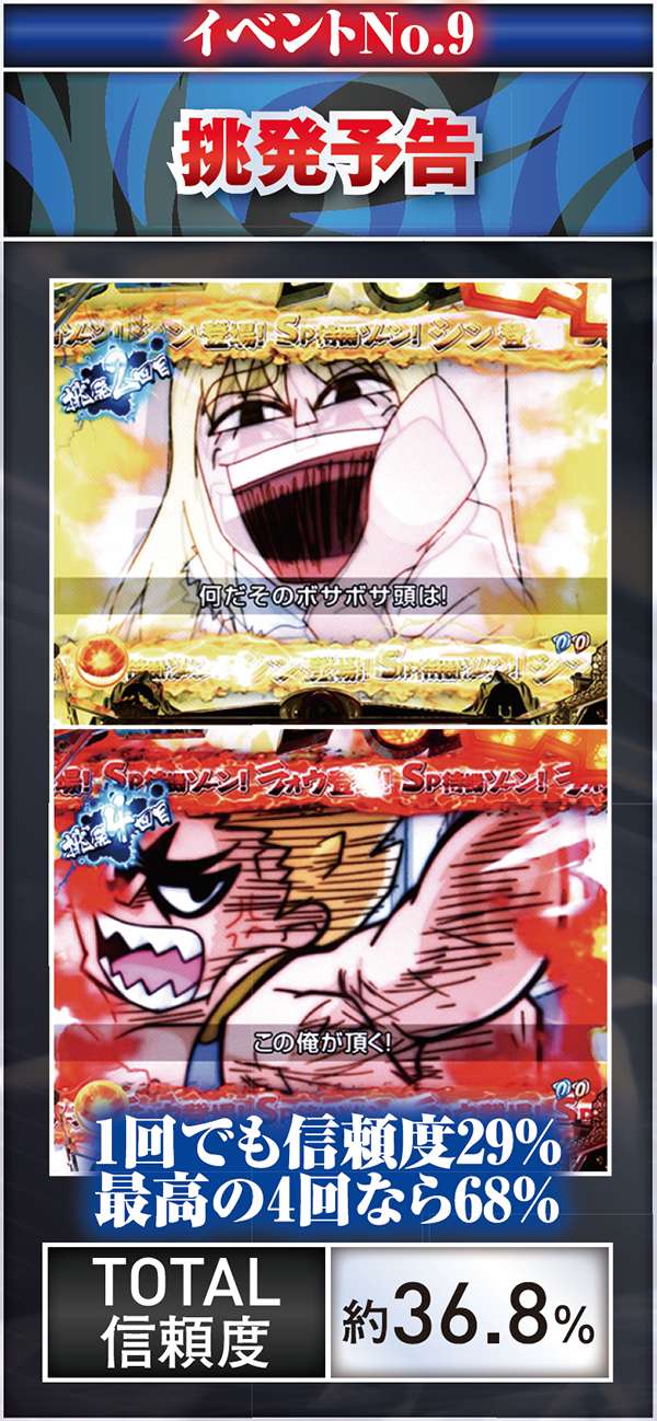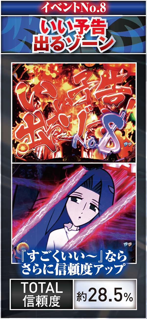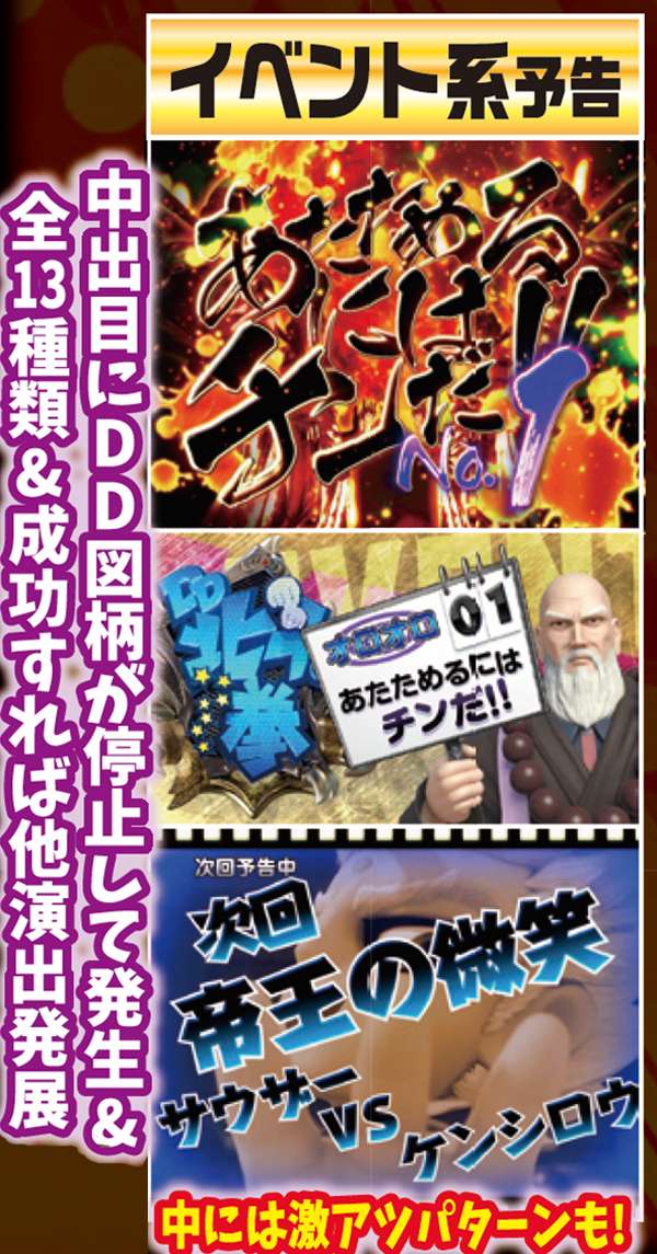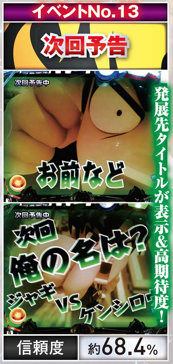 イベント系予告は全13種類存在し、内容によって信頼度が大きく変化する。NO.10〜13までの4種類は発生すれば約半数が大当りに。NO.7なら超激アツだ。