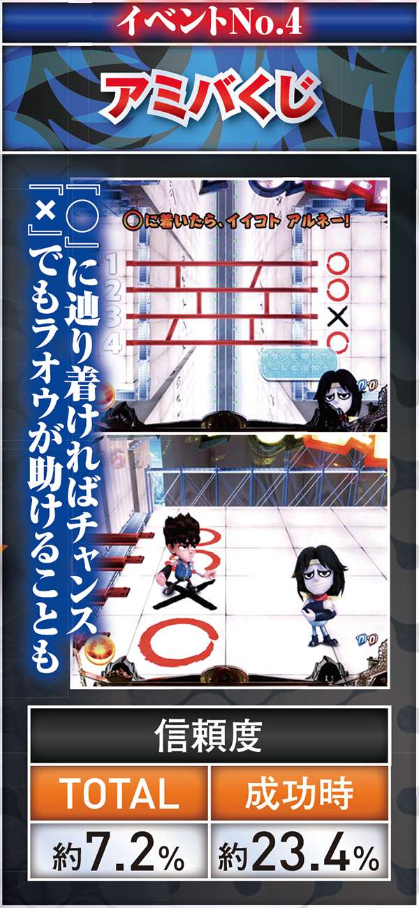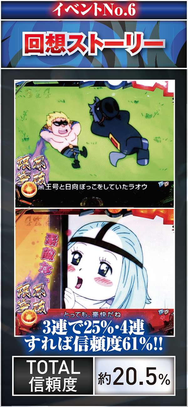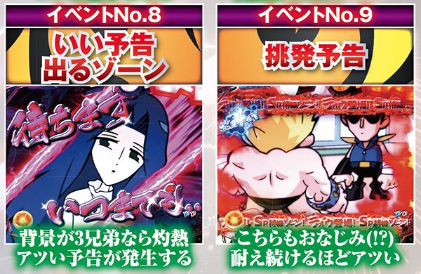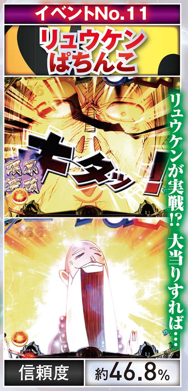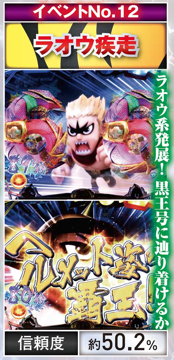 イベント系予告は全13種類存在し、内容によって信頼度が大きく変化する。NO.10〜13までの4種類は発生すれば約半数が大当りに。NO.7なら超激アツだ。