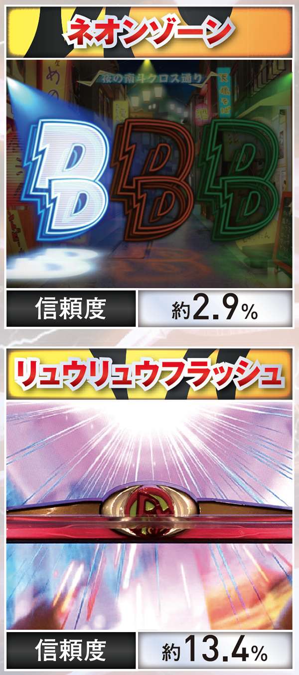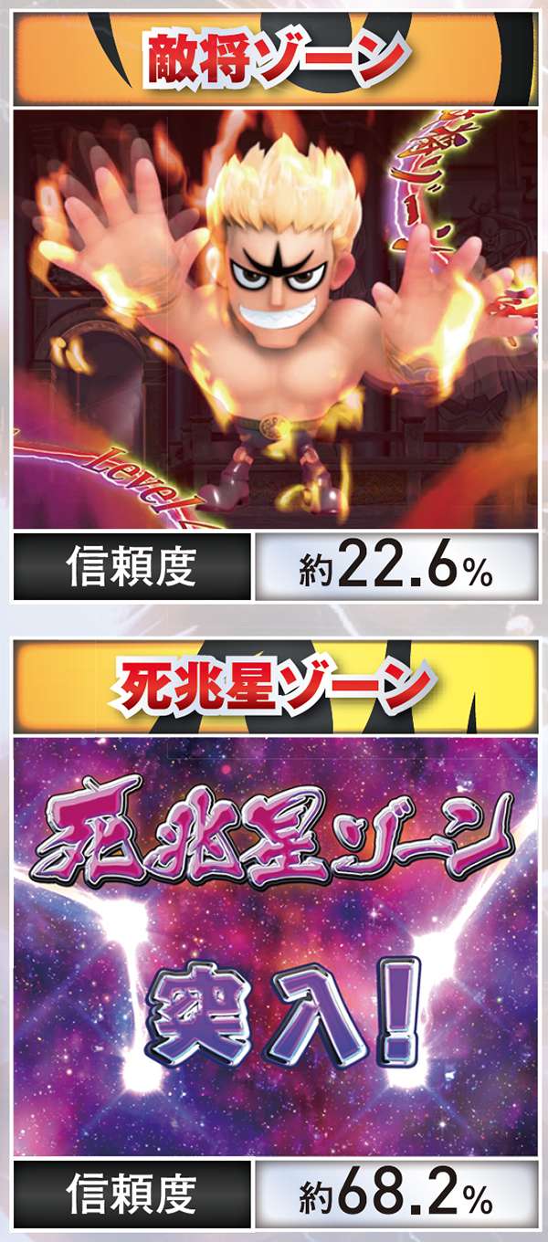 期待できるのは死兆星とドキドキの両ゾーン。他は敵将ゾーンならラオウで好機、ネオンゾーンなら赤文字でチャンスとなる。入賞時に発光するリュウリュウフラッシュも要注目だ。