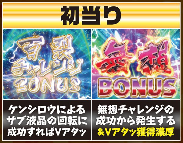 一般的なV-ST機と同様に、初当りの百裂チャレンジボーナスではラウンド中演出に挑み成功すればVアタッを獲得。電サポ中の大当りでは16R獲得演出成功でMAXラウンド、失敗してもVアタッ獲得は補償されSTループ濃厚だ。