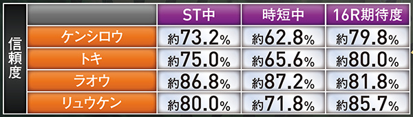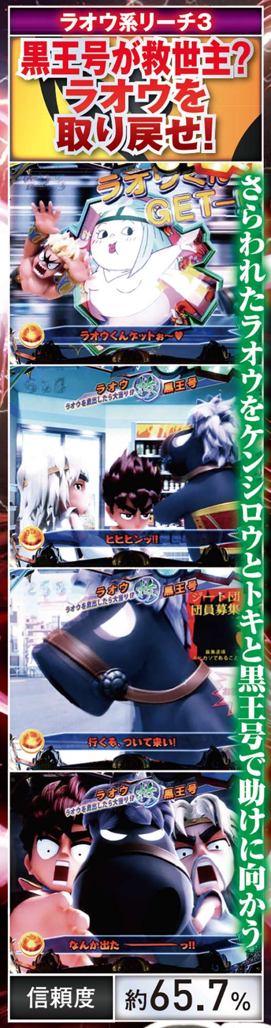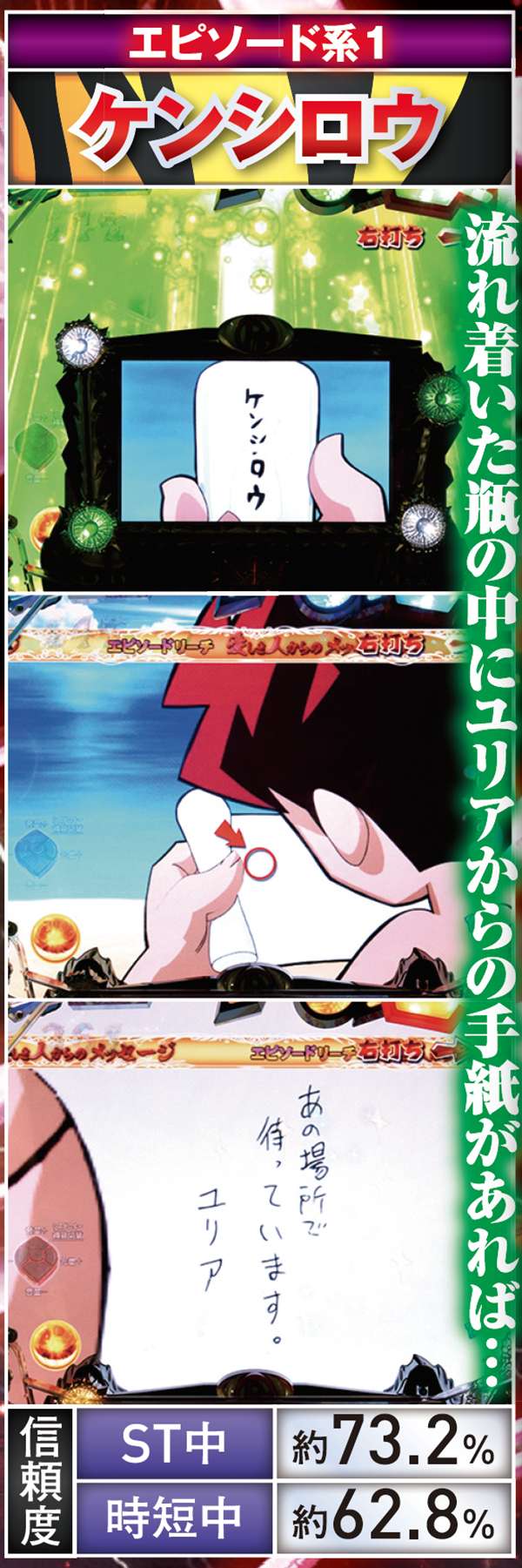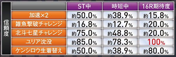 これらのリーチは状態によって信頼度に大きな差が生じるので注意。ケンシロウ生着替えとユリア沈没は16R期待度が高く、特に後者はST・時短中問わず激アツ&当たれば2200発濃厚だ。