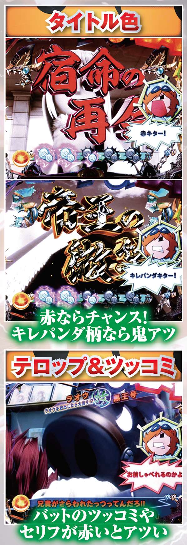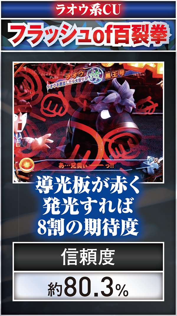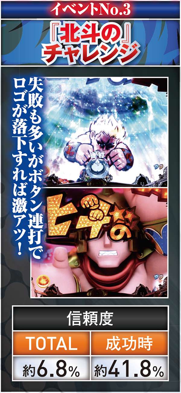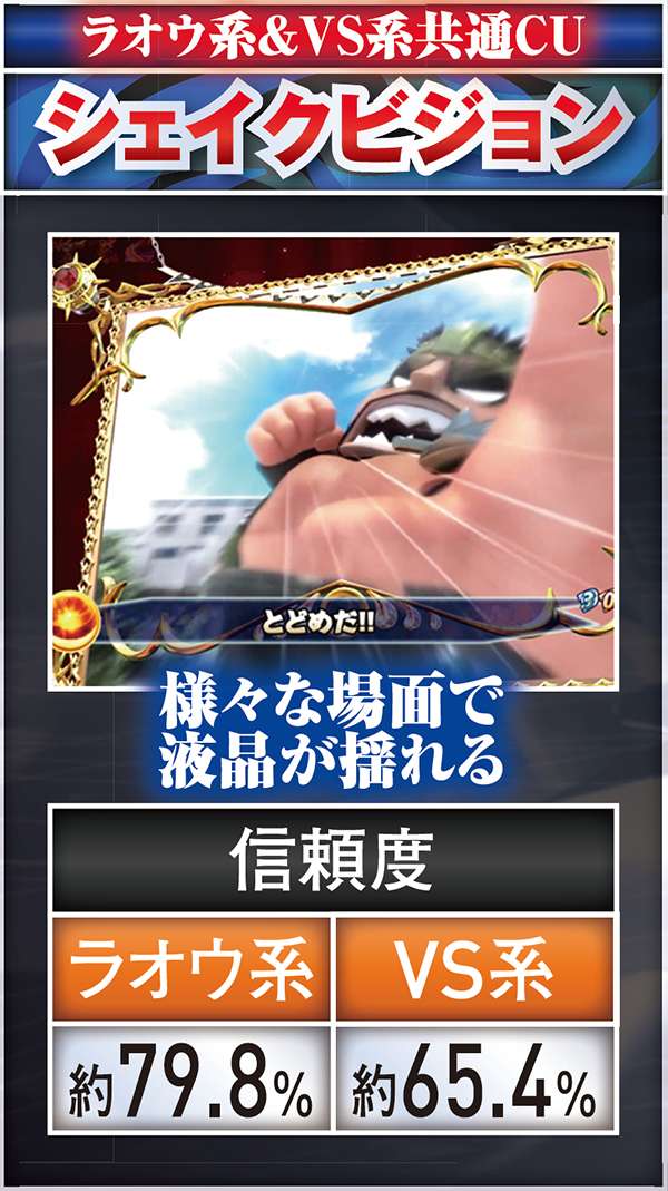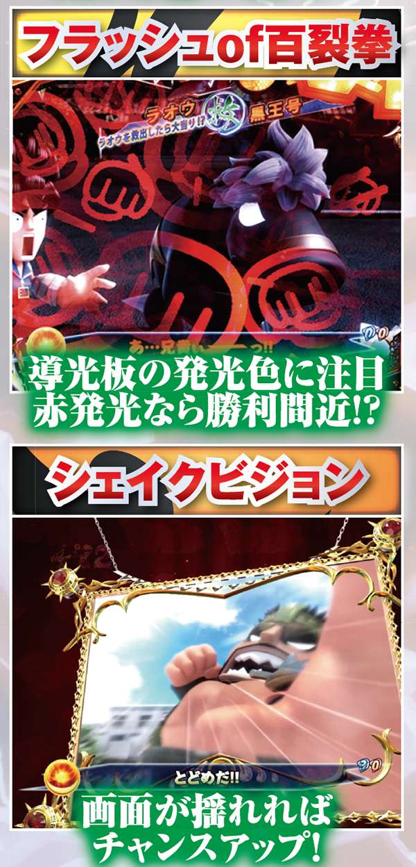 リーチ中のチャンスアップは複数存在。ラオウ系はツッコミ&テロップの色、VS系はサブ液晶に注目しよう。いずれも赤系の演出が発生すれば信頼度は一気に上昇するぞ。