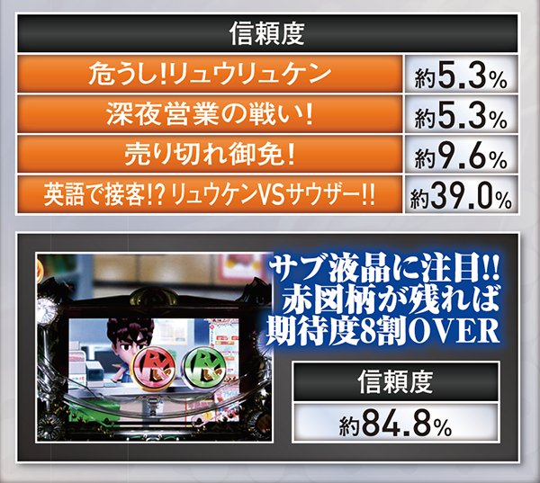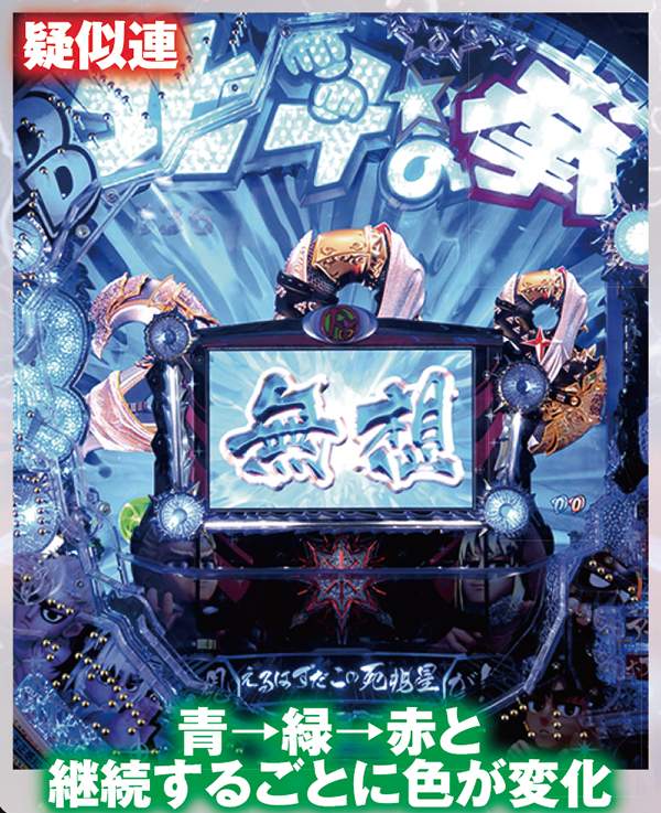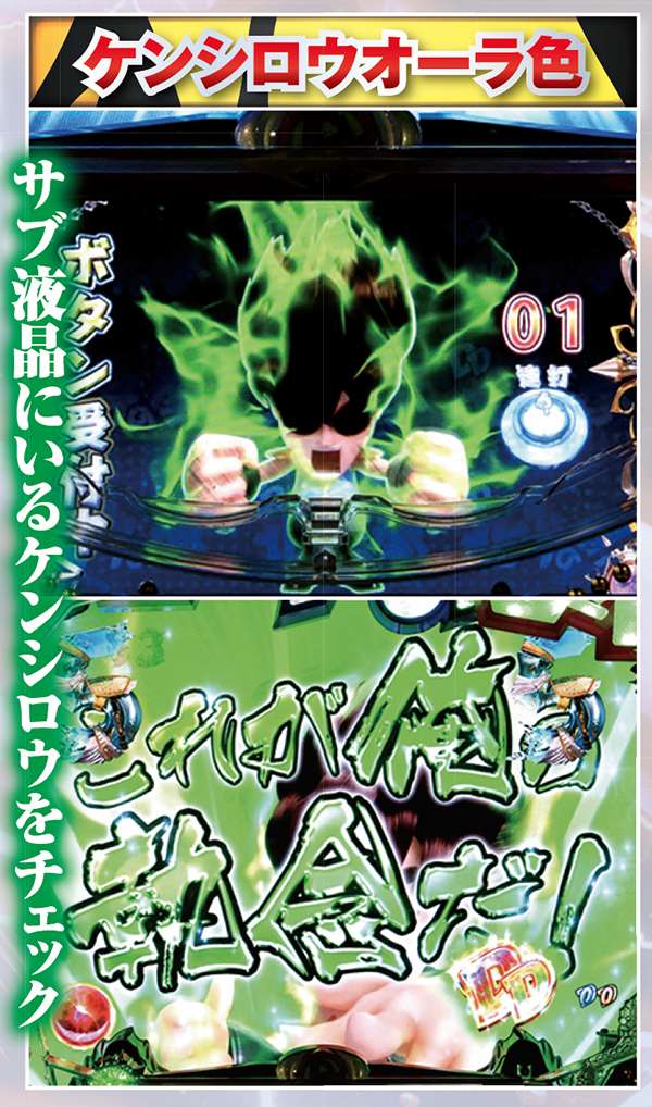 リュウケン図柄が3つ揃うとコンビニ系リーチへ発展。VSサウザーリーチ以外は期待薄だが、サブ液晶のケンシロウが売る図柄で赤色が残れば激アツ必至だ。