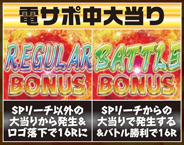 ST中はSPリーチで大当りするとバトルボーナスに突入。ラウンド中の戦いに勝てばロゴが落下して16Rに昇格となる。赤系演出の発生に期待しよう。