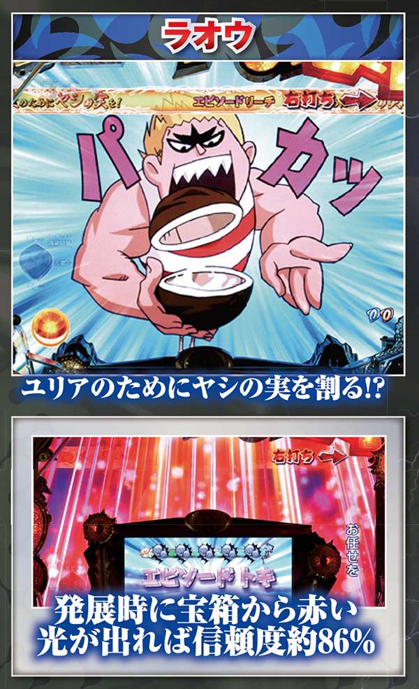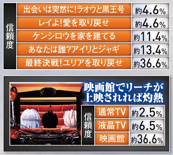 画面が部屋ステージに移行すればアニメ系リーチへ発展。「最終決戦!ユリアを取り戻せ」やリーチが映画館で上映されれば信頼度は高騰! 約4割が大当りに結びつく。