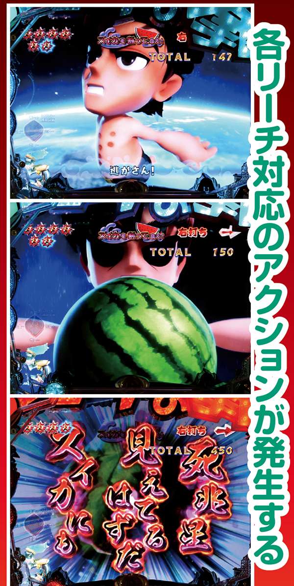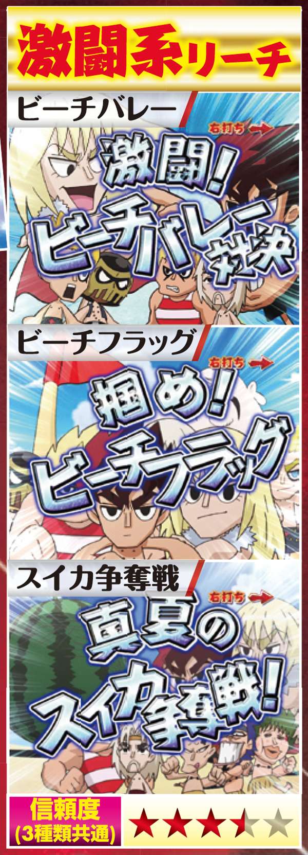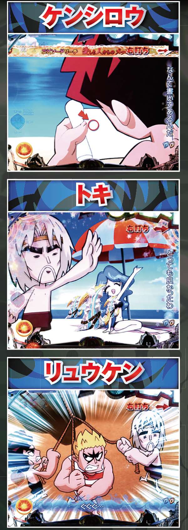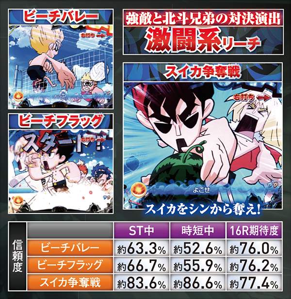 激闘系と浜辺系はそれぞれ3種類のリーチを搭載。「ユリア沈没」はST中に発生すれば激アツ必至。他にケンシロウが水着になれば大当りとなる「生着替え」など多彩な演出が存在する。