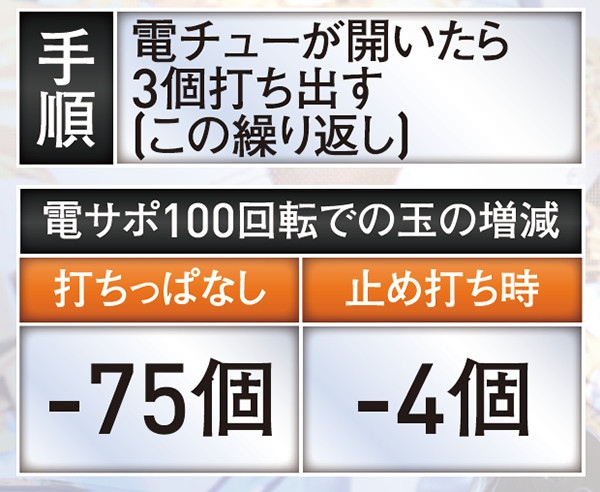 止め打ち手順は上記の通り。打ちっぱなしと比べて1回転あたり0.7個ほど玉減りを抑えることが出来た。スルーの抜けによって効果が変わるが、難しくないのでチャレンジしよう。