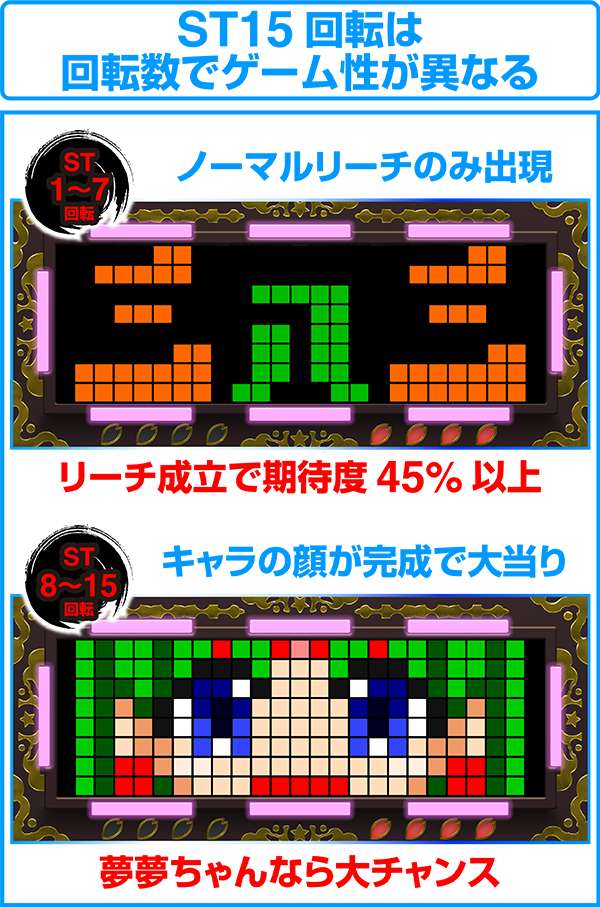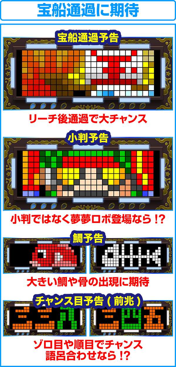 今度の夢夢ちゃんは福とともに宝船に乗って登場! ヘソ賞球5個に加え、大当り後に必ずST+時短が付くスペックは遊びやすさも抜群。もちろん、潜伏判別などは不要だ。 15R割合も高めと出玉感も味わえる仕様となっている。 カラードットで展開されるシンプルで奥が深い演出も注目。語呂合わせなど隠された要素も満載だ。 |