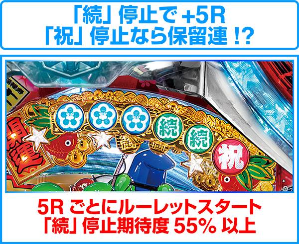5・10R目は盤面上部のルーレットランプに注目。「続」に停止するごとに+5R継続。最大ラウンド数の15Rを目指そう!