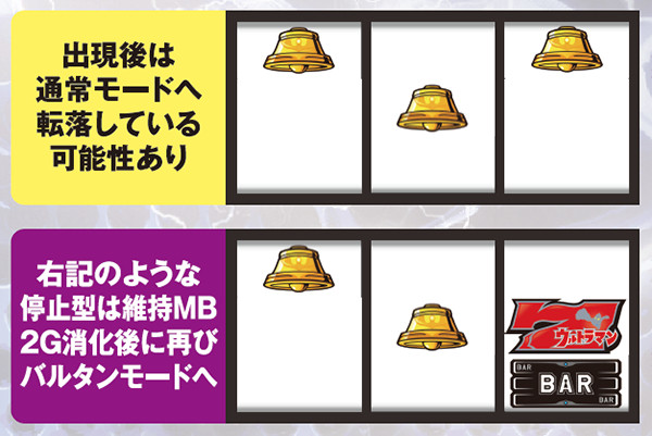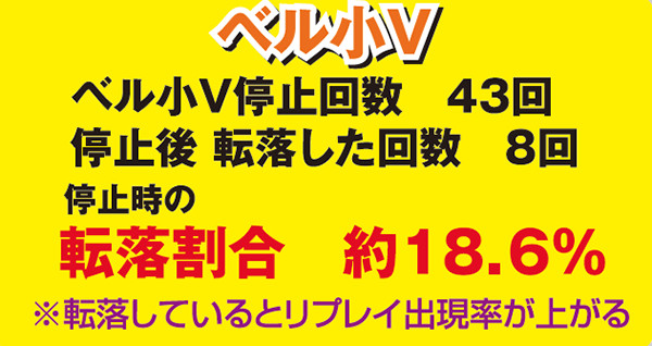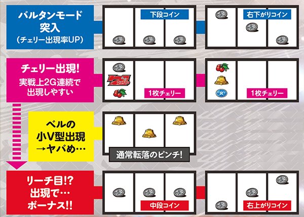 コインは揃うラインによって役割が変化するものの、出目法則は至ってシンプル。ベル小V型が出現すると……高確率状態終了のピンチとなる。