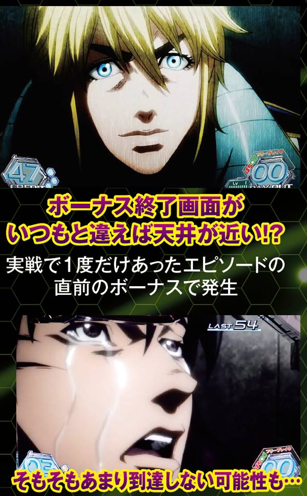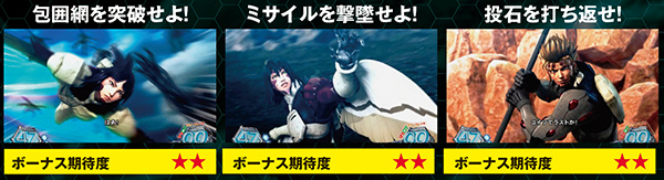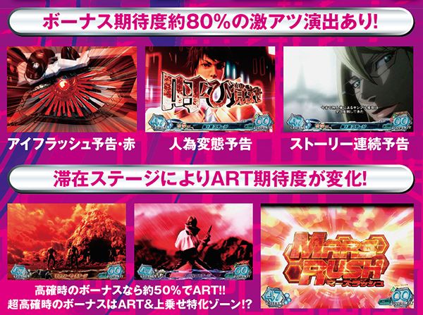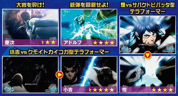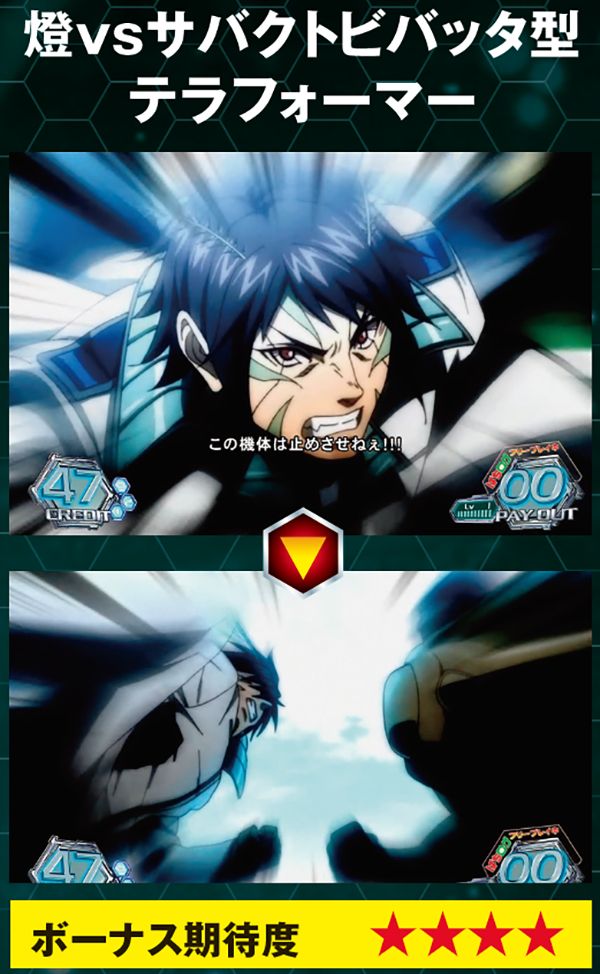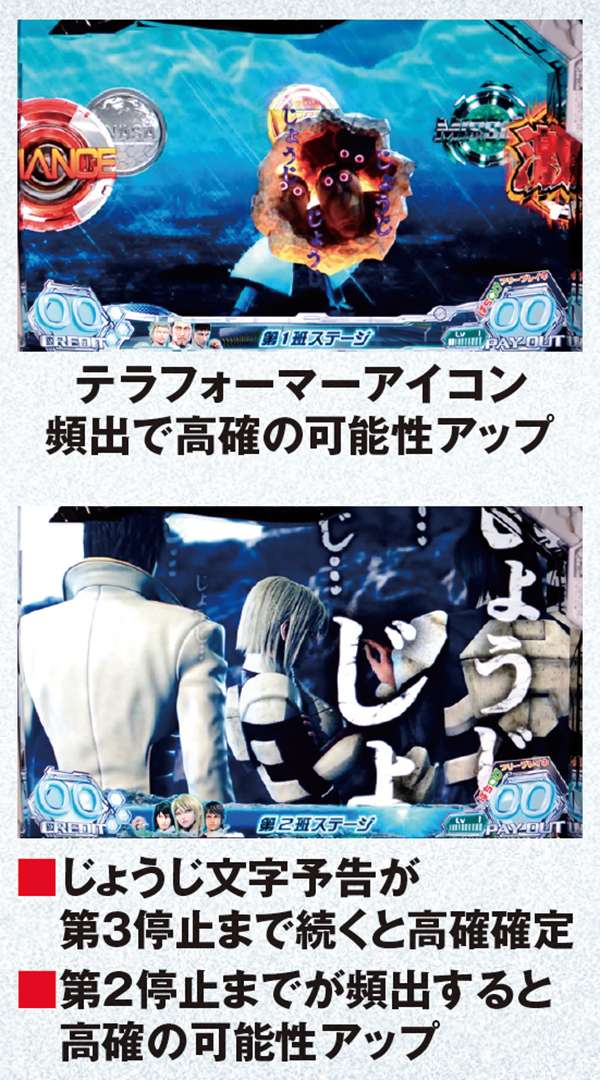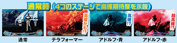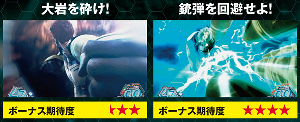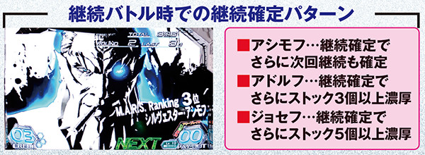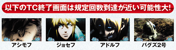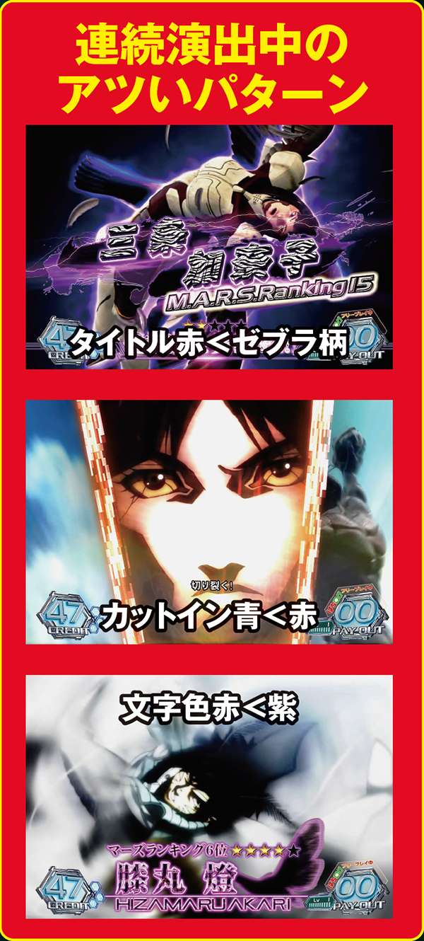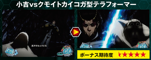 連続演出が発生するといずれもボーナスに期待できるが、特に作中でのマーズ・ランキング(対テラフォーマーの戦闘能力)上位者であるアドルフや小吉は期待度が高め。タイトルやカットインの色にも注目だ。