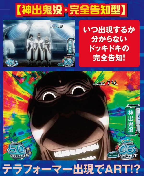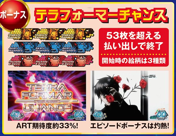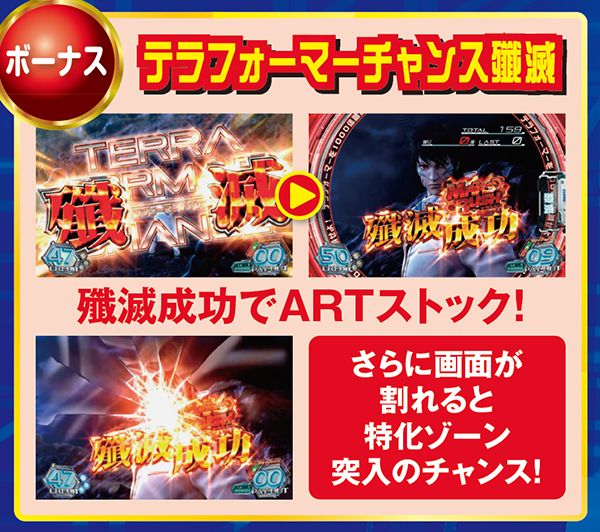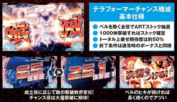 ART中のボーナスはテラフォーマー殲滅でARTストックが確定。なお本機のストックは次回継続のみが確定するタイプで、複数ストックした場合はその数だけ継続が保証されることとなる。