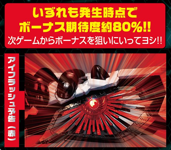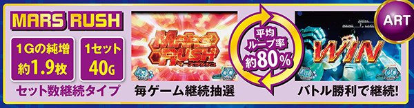 出玉増加のメインは1セット40G、1Gあたり約1.9枚増のART「MARS RUSH」で、平均ループ率はなんと約80%。ただでさえロング継続が可能なのに、そこにボーナスや特化ゾーンによるARTストックが絡むため、その性能はまさに「極限ループ」と呼ぶに相応しい。 さらにそのループの発端となるボーナスの確率は最低でも149分の1と高く、「いつ、どこからでも出る」ヤツらの特徴は確実に受け継がれている。 |