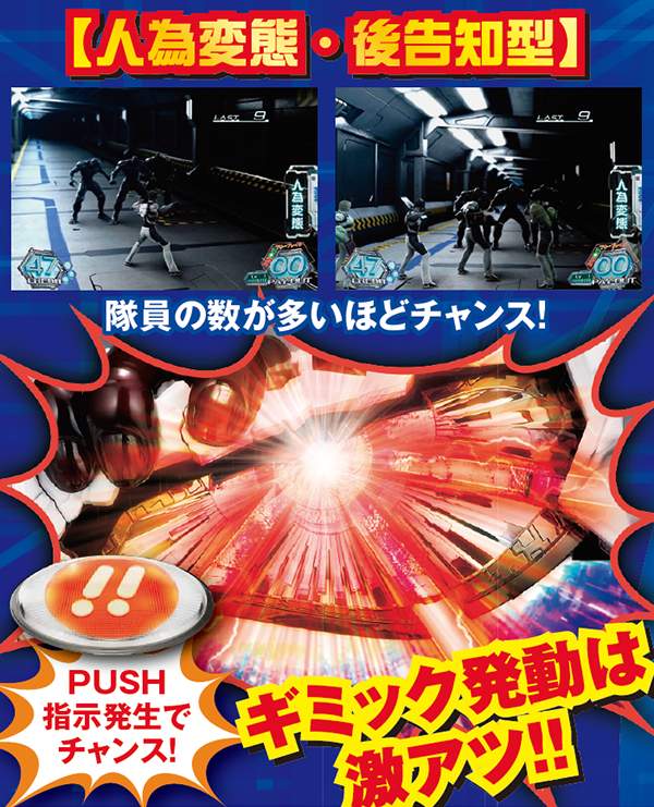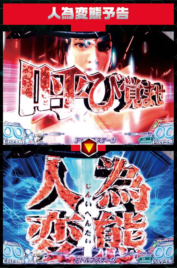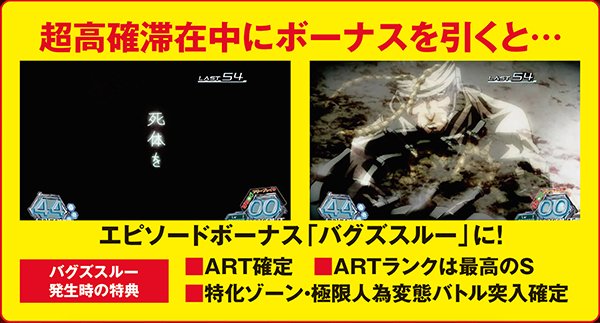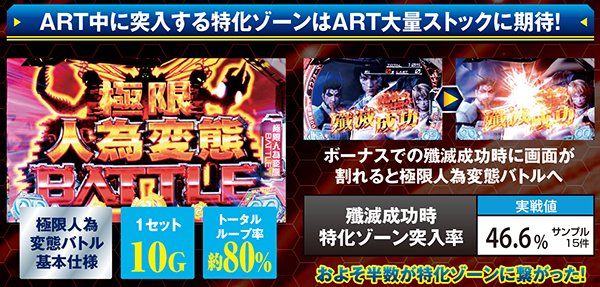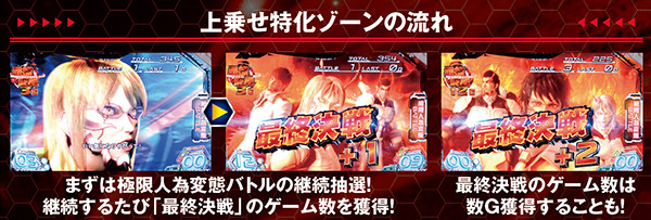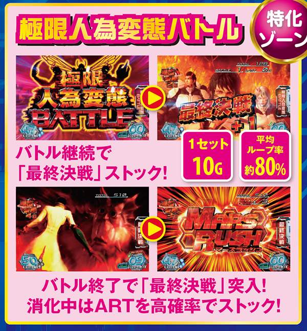 特化ゾーンは2部構成で、まずは「極限人為変態バトル」にて「最終決戦」のゲーム数を貯めていく。ループ抽選に漏れると今度は最終決戦へと移行し、ここで攻撃を成功させるたびにストックを獲得できる。本機は特化ゾーン自体の継続率も高いので、消化にかかるG数も積もると馬鹿にならない。
