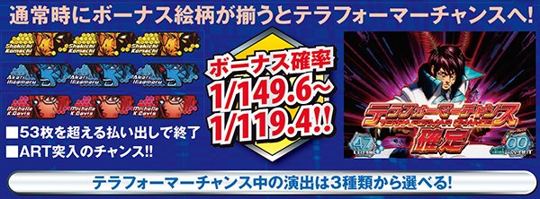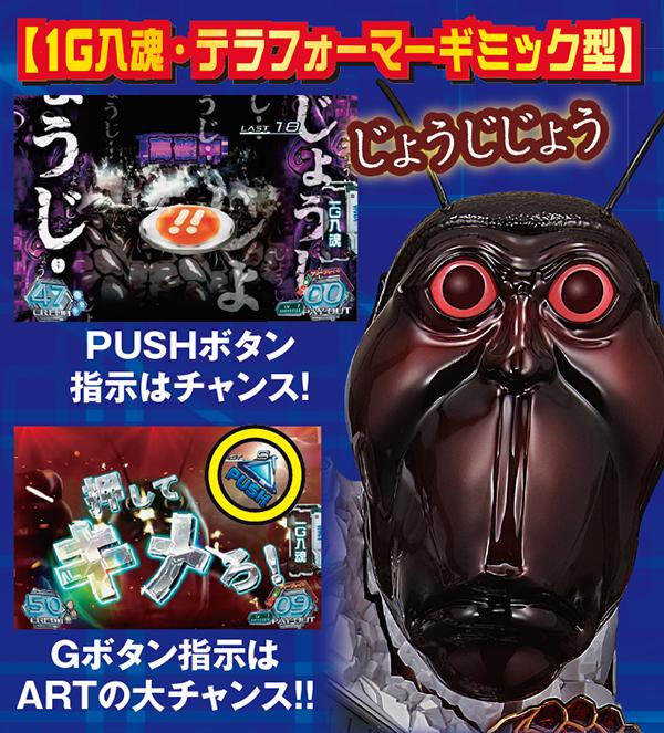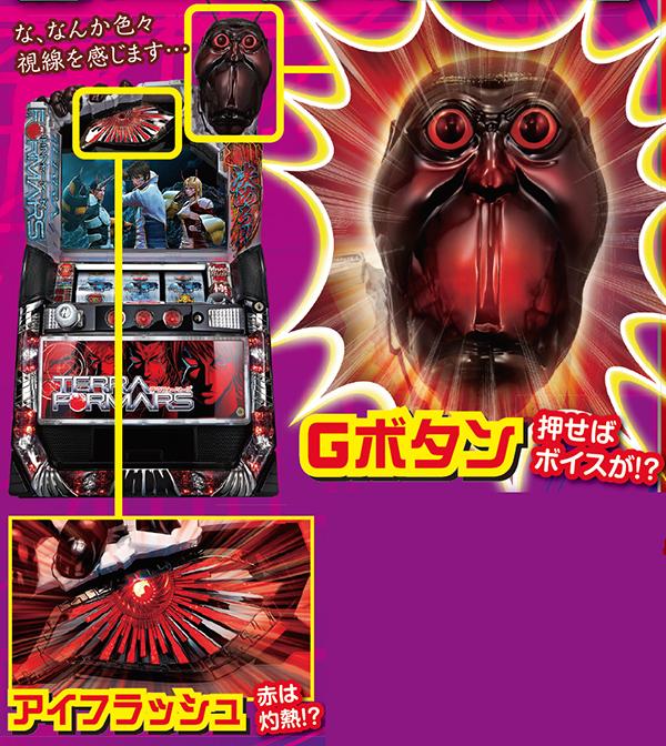 テラフォーマーチャンス中の演出は3種類。Gボタンやアイフラッシュなど様々なギミックが活躍し、プレイを盛り上げてくれる。Gボタンをビシッとやりたければテラフォーマーギミック型を、触れたくなければその他を選ぼう。