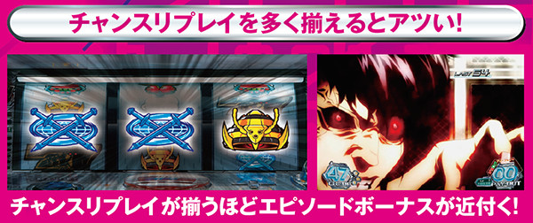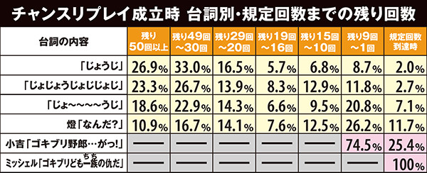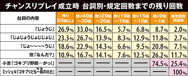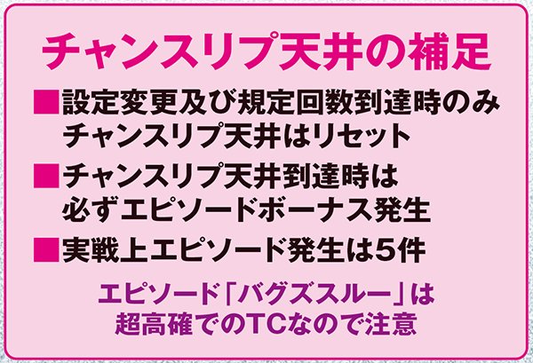 チャンスリプレイ成立時は必ず筐体右上のGボタンを押し、台詞をチェック。小吉やミッシェルならチャンスリプ天井が近いのでエピソード発生まで打ち切りたい。各種終了画面で上記のレアパターンが出た場合も同様だ。