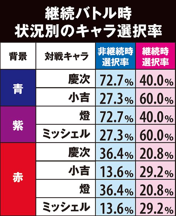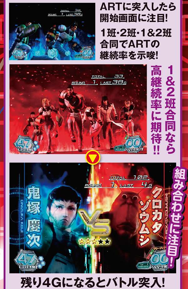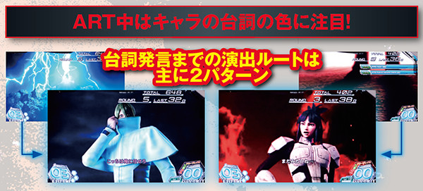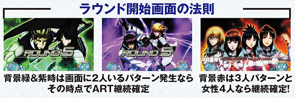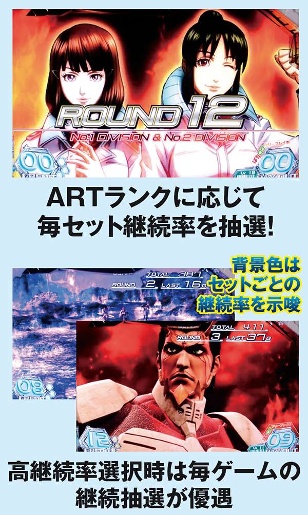 ART中は背景の色で継続率を示唆しており、青<紫<赤の順で高継続率に期待できるのだが、ラウンド開始時の画面で既にそれを見極めることが可能(ただし背景青の場合、ラウンド開始画面は緑なので注意)。さらに同じ色でも様々なキャラクターの組み合わせが用意されており、アツい組み合わせもあるようだ。