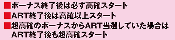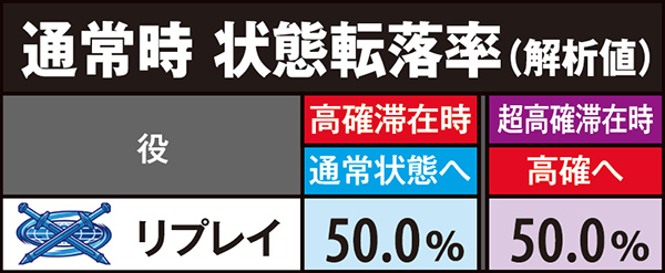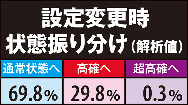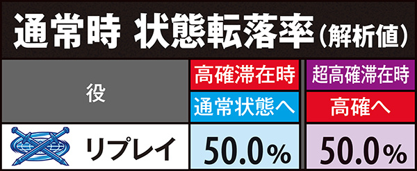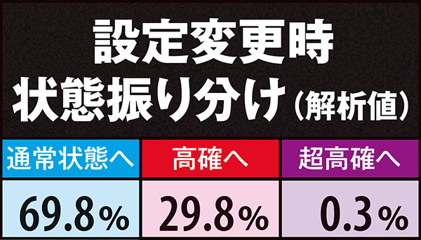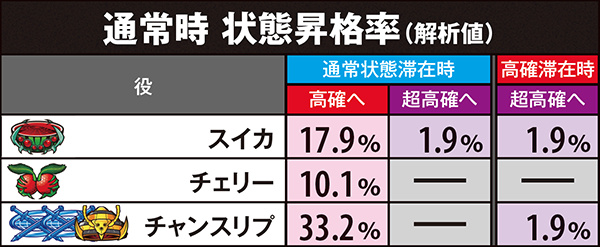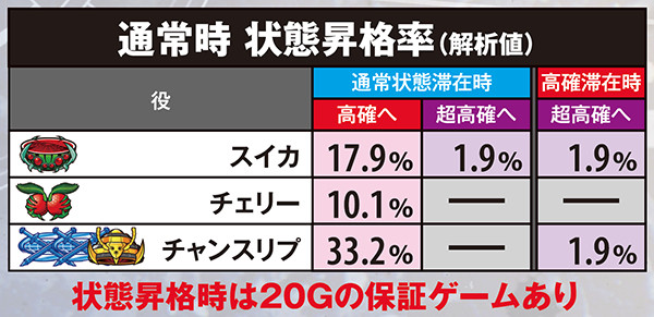 通常時の状態は通常、高確、超高確の3つ。状態昇格はチャンス役によって行われ、昇格時は20Gの保証がある。またボーナスやART後は高確以上確定だ。