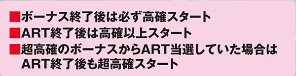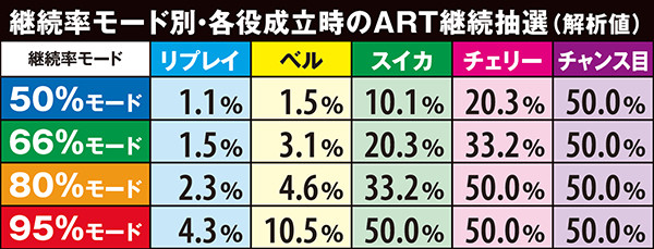ARTは1セット40Gのセット数継続型で、ゲーム数を上乗せすることはない。消化中は次セットへの継続抽選を行っており、チャンス役成立後にBGMが変わるなどして次回継続を示唆するケースも見られた。