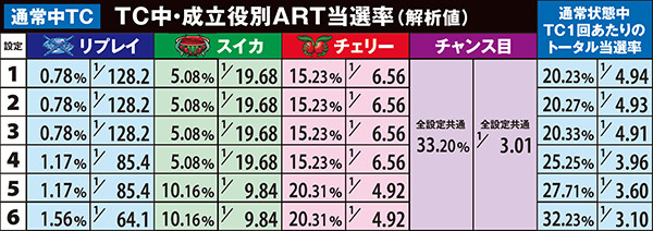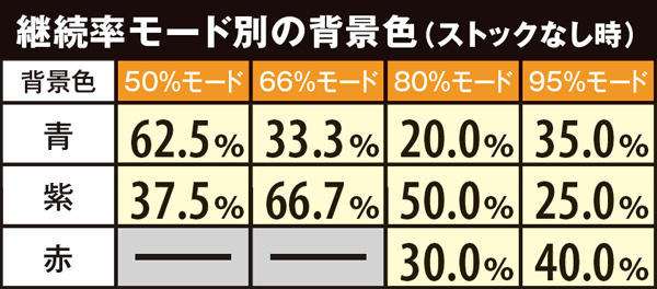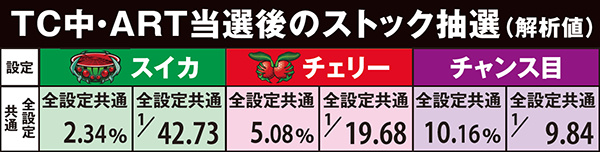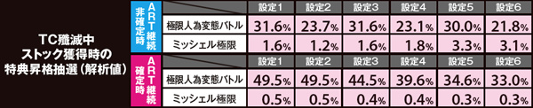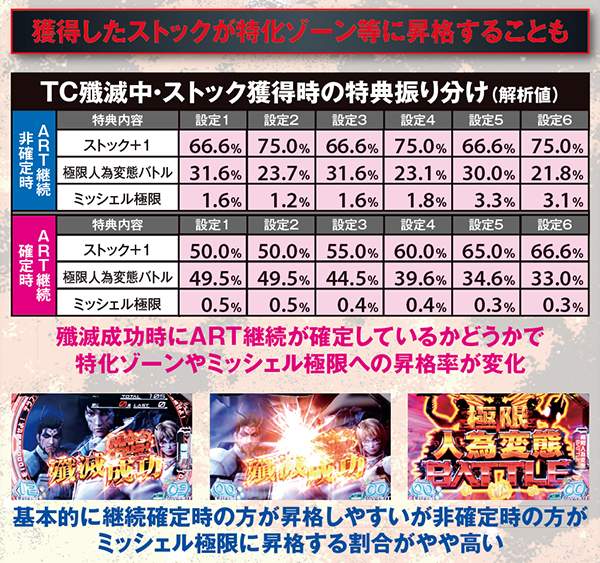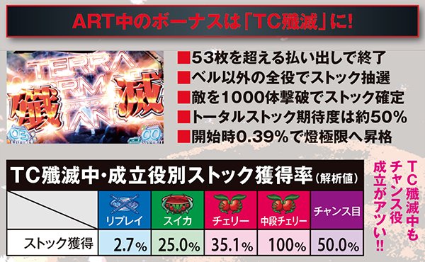 TC殲滅成功時は上乗せ特化ゾーン突入のチャンスでもあるが、その詳細な突入率が判明。すでにストックを獲得しており次回継続が確定している場合は特化ゾーンへと昇格する割合が高くなっている。