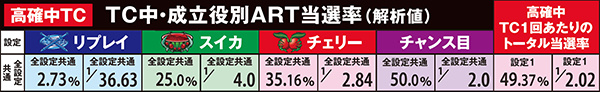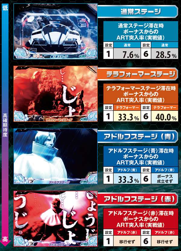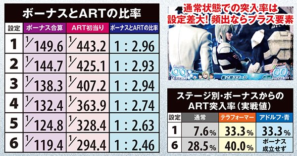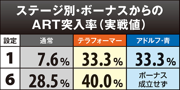 通常時に引いたボーナスからのART突入率は滞在ステージにより大きく異なり、高確や超高確に期待できるアドルフステージは激アツとなる。またボーナスが成立するまでにチャンスリプレイがどれくらい揃っているかも重要で、数多く引くほどエピソードボーナスが期待できるようだ。