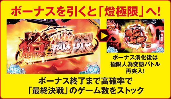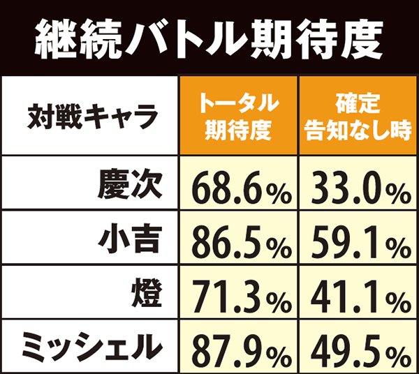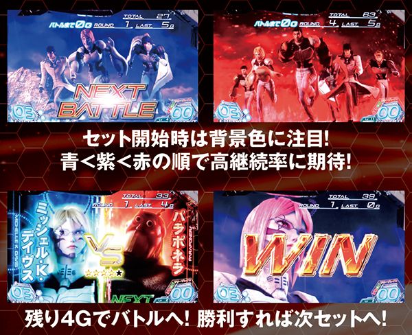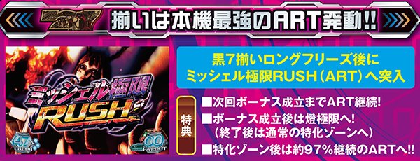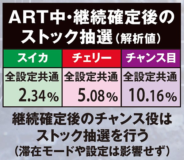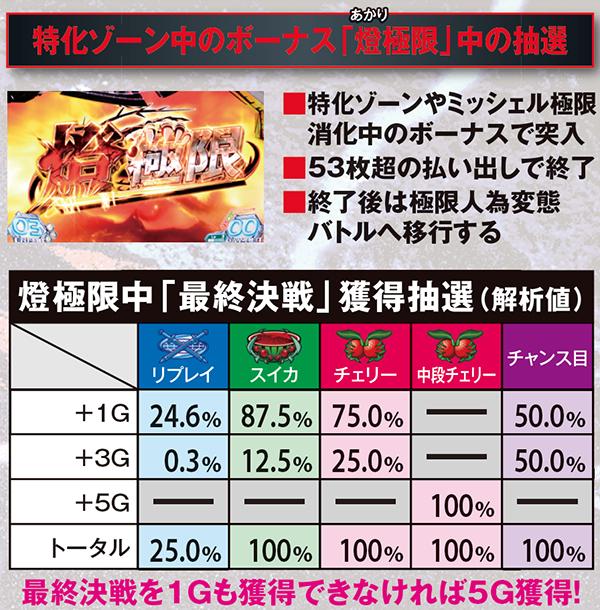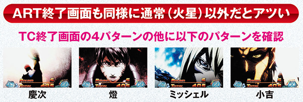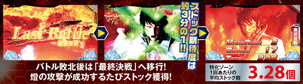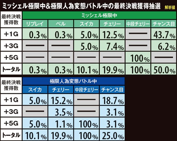 プレミアムARTであるミッシェル極限中や、特化ゾーン極限人為変態バトル中は「最終決戦」の継続G数を獲得。消化後に訪れる最終決戦は約1/3でストックを獲得できる。