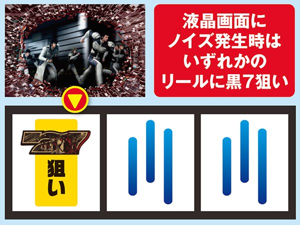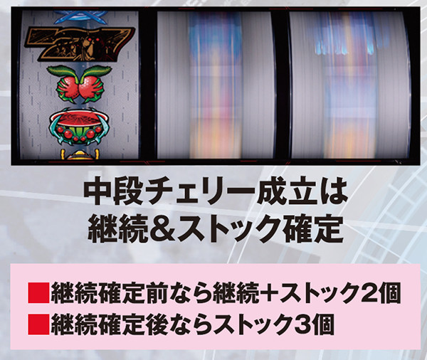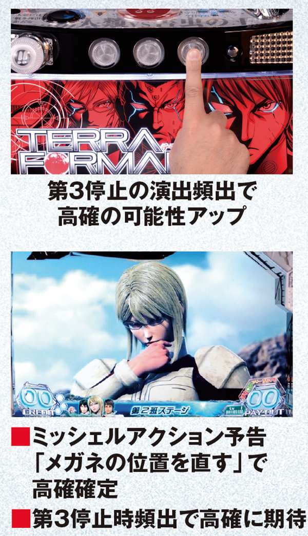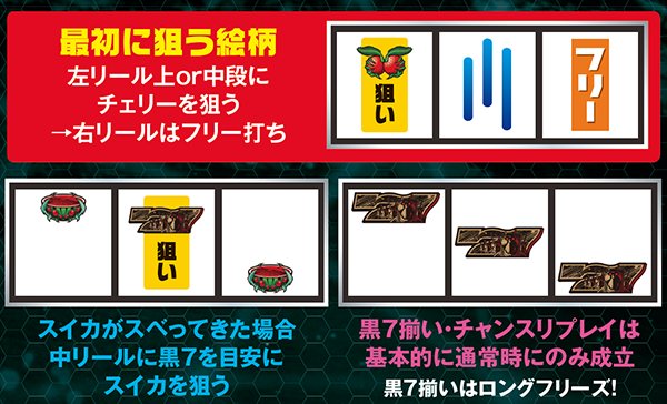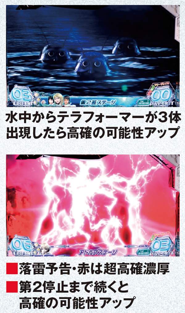 まずは左リールにチェリーを狙い、右リールをフリー打ち。スイカがテンパイした場合のみ中リールにスイカを狙おう。チャンス役はボーナス重複はもちろんのこと、状態昇格にも期待できるため出現後は液晶の動向にも注目。テラフォーマーステージやアドルフステージ移行時は高確滞在に期待できる。