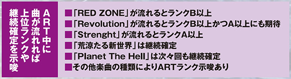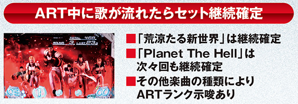本機はART中に曲が変わって継続を示唆することがある。それらが発生する前は見慣れないキャラ(アシモフなど)が現れるケースが多かったので、そうした演出が続くようなら期待していいだろう。またバトルの内容や歌の種類によっては複数継続を示唆するケースもあるようだ。