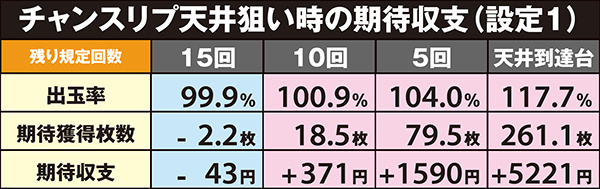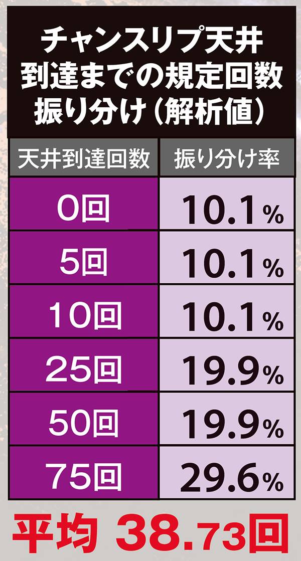 チャンスリプ天井とは、規定回数チャンスリプが成立してからボーナスを引くとARTが確定する機能のこと。最大回数である75回が選ばれた場合、到達までに必要なゲーム数は平均で4912Gだ。