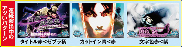 連続演出発展時は、まずタイトルの色に注目。ここでゼブラ柄なら勝利の期待大となろう。カットインの色や文字の色にも期待度示唆が盛り込まれている。