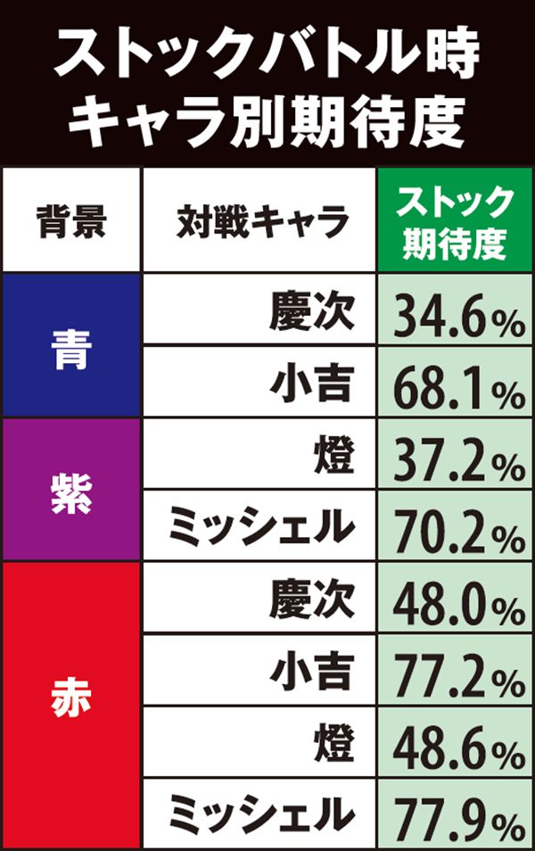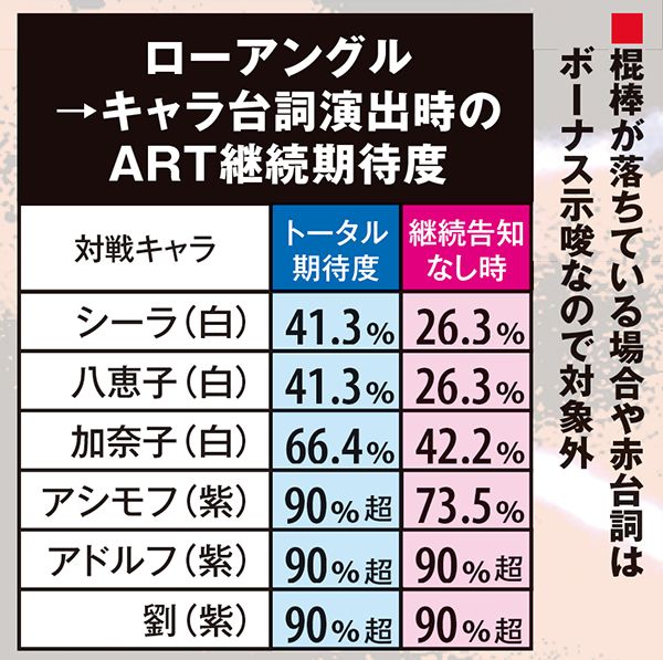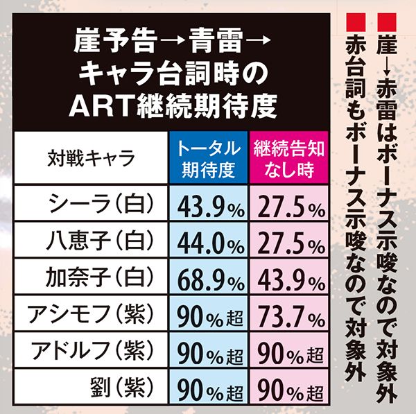 崖予告から発展した場合も、ローアングルから発展した場合も基本的にはキャラごとの期待度の傾向は同じ。ただしどちらもボーナス示唆の役割を果たすパターンがあるので混同しないように注意しよう。