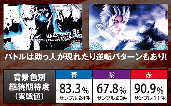 ART中の演出は立ち回りに直結するわけではないが、ドル箱にコインを移すタイミングを知る上で役立つ。特に継続バトルで助っ人が現れると激アツで、原作でのマーズ・ランキング上位者ほど大量ストックに期待できる。