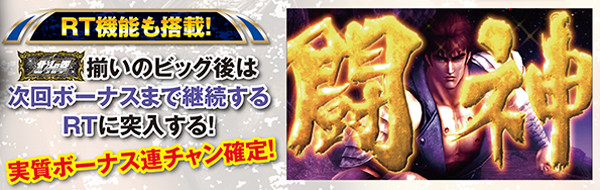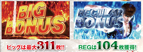 | 機種概要 | 回胴界を代表するトップブランドこと「北斗の拳」シリーズに、また新たなマシンが加わった。サミーの放つ最新作は、その名も『A-SLOT北斗の拳 将』。南斗五車星が守護する「将」、すなわちユリアをパネルに据えた本機は、シリーズの中では3作目となるボーナスタイプ。最大311枚獲得のビッグと104枚のREG、そして次回ボーナスまで継続するRTのトリガーでもある北斗揃いビッグによって出玉を増やしていく仕様だ。 |