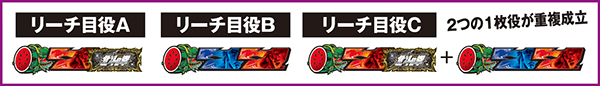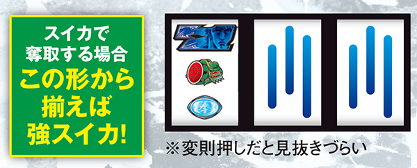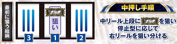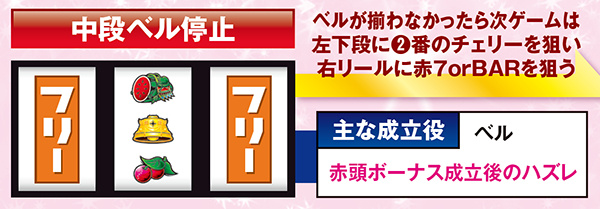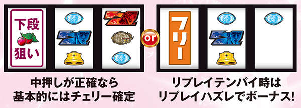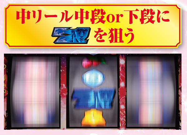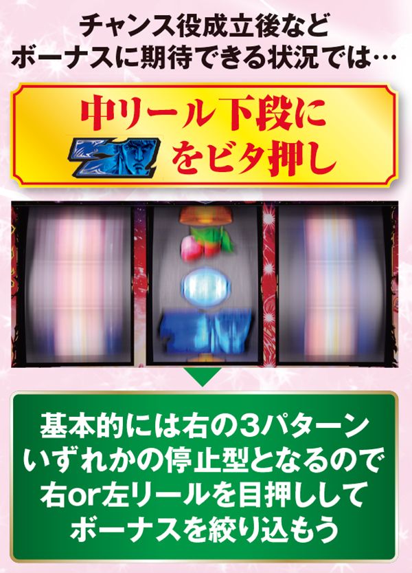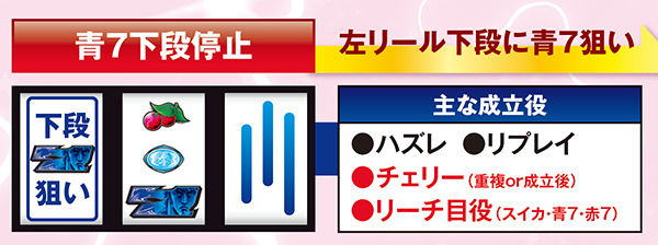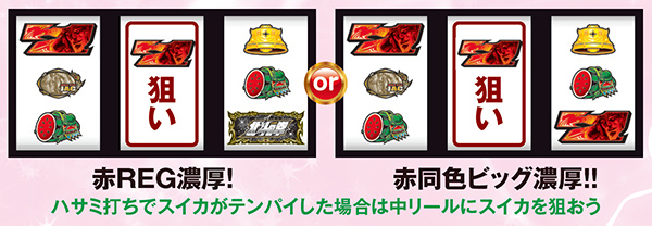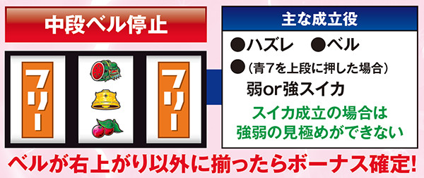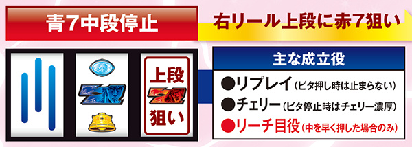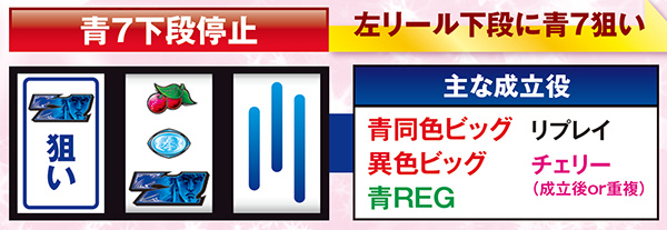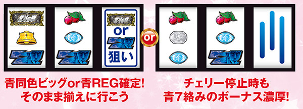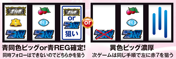 演出などからボーナスの成立を察知できたら、ロスを最小限に抑えるべく、1ゲームでも早く揃えよう。そのための手順として覚えておきたいのが上記の方法で、青7が下段でテンパイすればその時点で青ビッグor青REGが確定。中リールがスベって「スイカ・ベル・チェリー」停止かつ小役否定なら、赤7系の成立とほぼ特定できる。