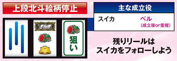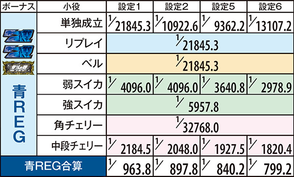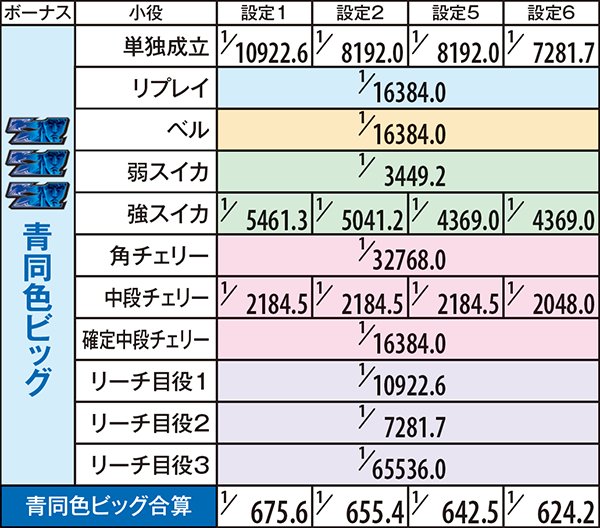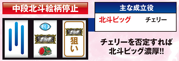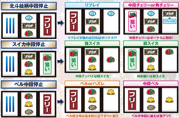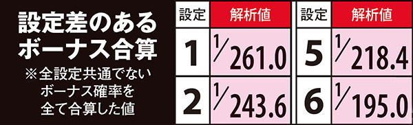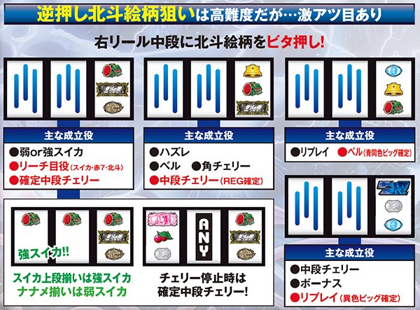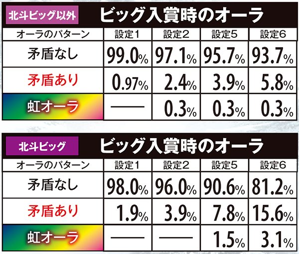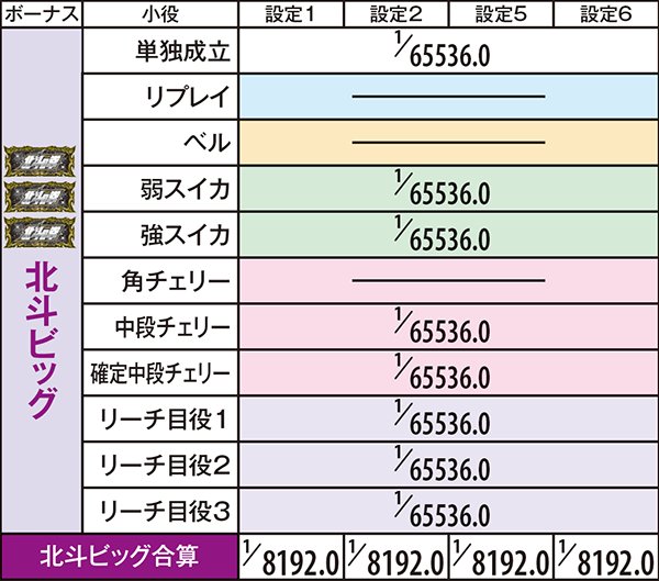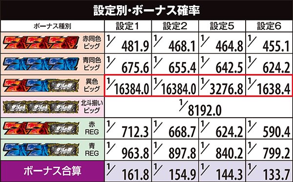 北斗揃い以外は、すべて高設定になるほど確率がアップ。合算確率も当然高設定ほど高くなっているので、設定推測要素ではあるのだが…、異色ビッグや4役合算ほど信頼できる差ではないので、過信は禁物だ。