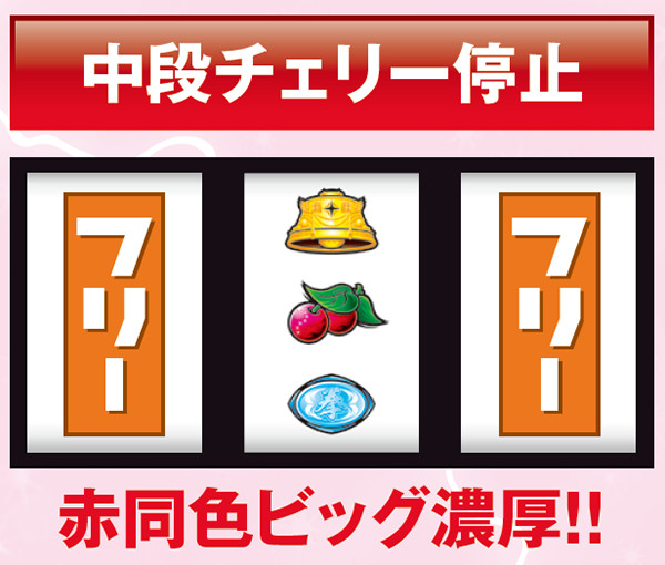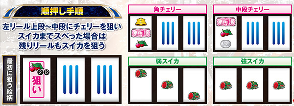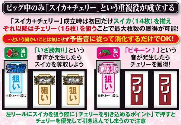 ビッグ中に「いざ勝舞!」の声が聞こえたら、左に青7付近を狙ってチェリーを避け、そのままスイカを揃えて14枚を取得しよう。この手順を一度だけ実践し、以後は予告音発生→チェリー狙いだ。
