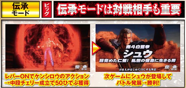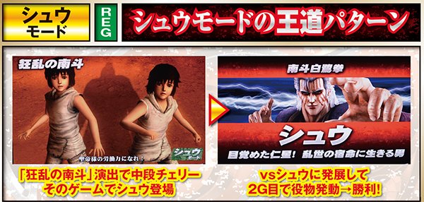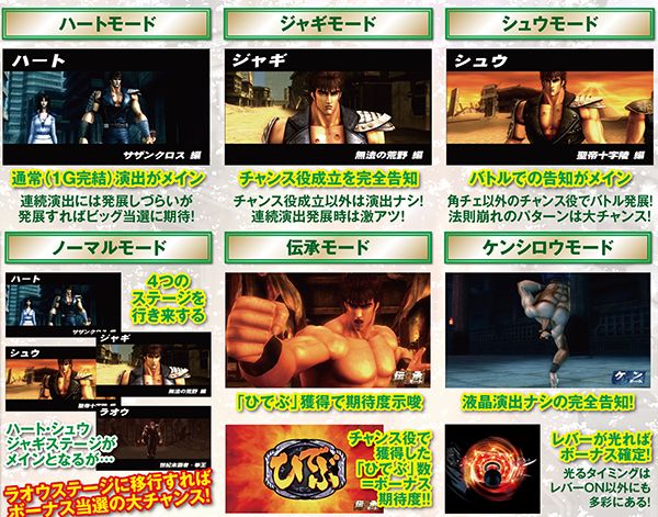 演出モードはハート、ジャギ、シュウ、ケンシロウ、伝承、ノーマルの計6種類が用意されており、PUSHボタンで自由に選択できる。バトルメイン、完全告知、ステージ移行型など…好みで選べばOKだ。