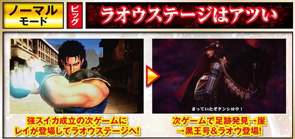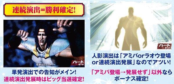 連続演出への発展はレアで、ボーナス告知の多くはプレミアム演出やいきなりラオウ登場などのパターンとなる。連続演出に発展することは滅多にないが、発展時はビッグ確定だ。