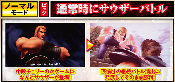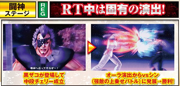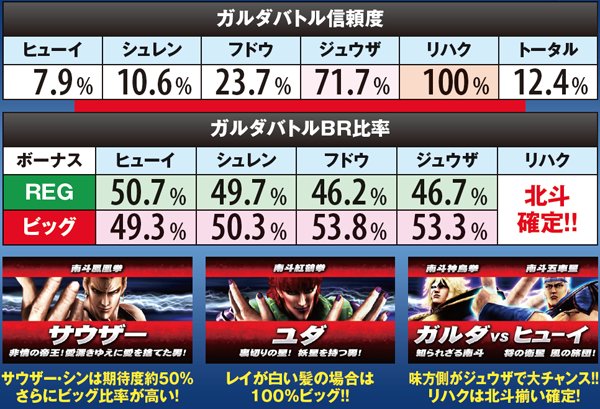 ノーマルモードではハート&シュウ、ガルダバトル以外に発展すればチャンス、ガルダバトルでもジュウザ以上であれば大チャンス到来だ。タイトルが「ガルダVS海のリハク」はプレミアムとなっており、出現時点で北斗揃いが確定する。また、サウザー&シンバトルはボーナス信頼度が約50%、さらに当選時はビッグ比率が約80%と、実はかなりアツ目の連続演出である。