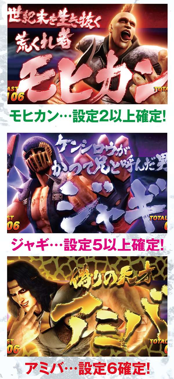 まずは味方(青)or敵(赤)のどちらを出すかを抽選。差はわずかだが、奇数設定は赤、偶数は青が出やすいという特徴がある。また、設定1以外はこのあとに「確定キャラへの差し替え抽選」が行われ、モヒカン、ジャギ、アミバの出現で設定1が否定される。