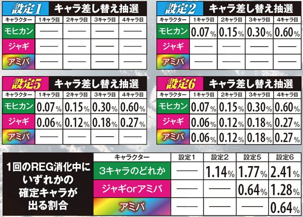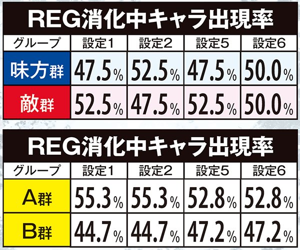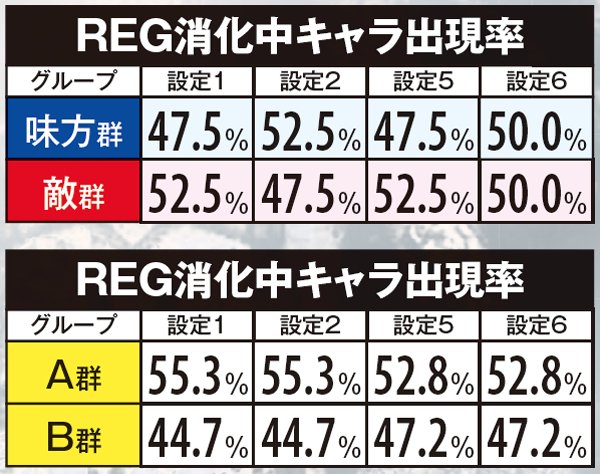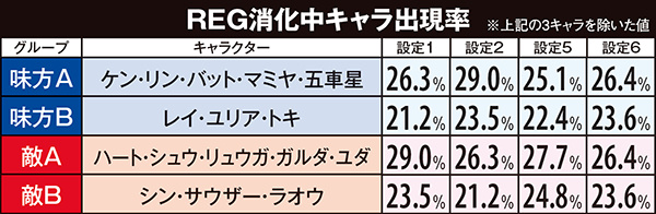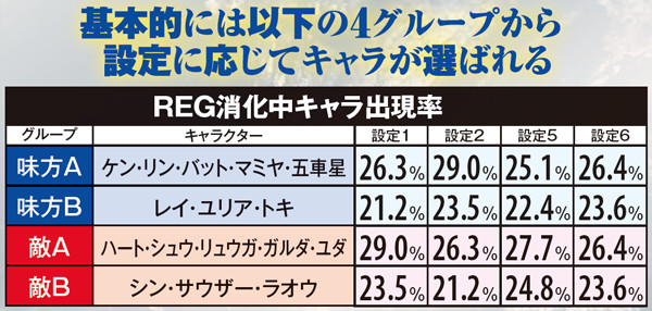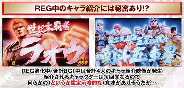REG中に表示されるキャラ画面は、味方群(青)と敵群(赤)の振り分けなどに設定差があるのだが、その差はわずかなので設定推測の判断材料としては弱い。ただし、モヒカンが現れた場合は設定1否定(2以上)、ジャギは設定5以上、アミバなら設定6確定なので、こちらは覚えておこう。